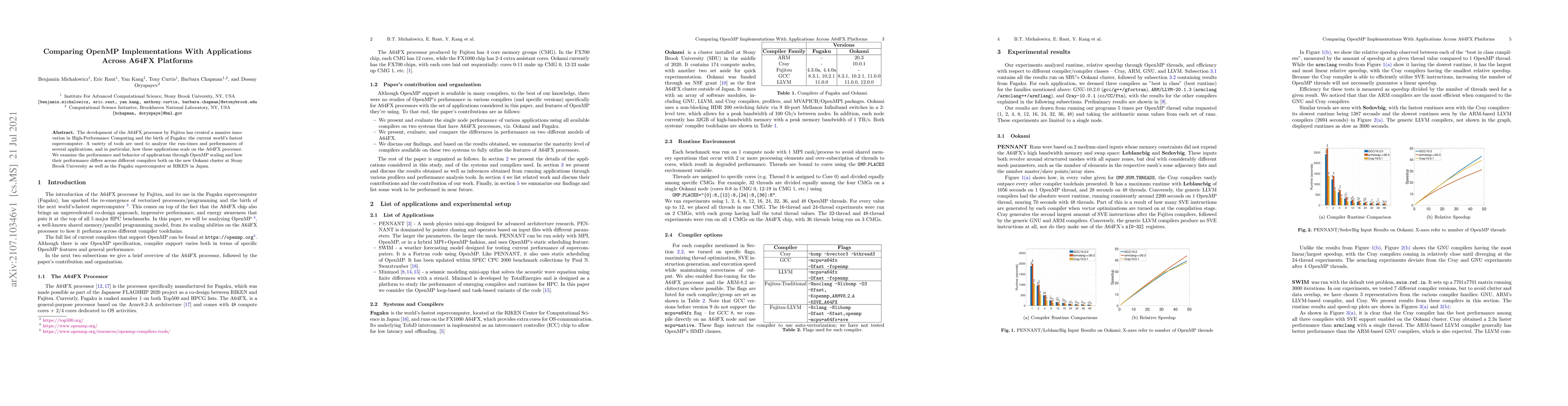 This paper investigates the performance of OpenMP implementations across applications on the A64FX processor, comparing results from the Ookami cluster and the Fugaku supercomputer to analyze how different compilers affect application scaling and run-times.