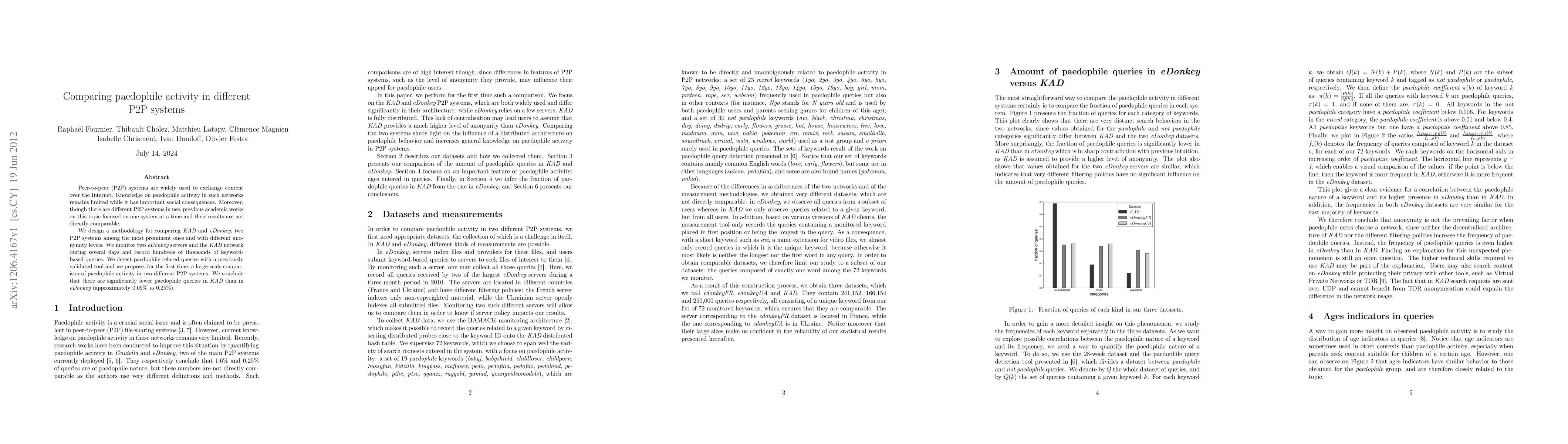 Peer-to-peer (P2P) systems are widely used to exchange content over the Internet. Knowledge on paedophile activity in such networks remains limited while it has important social consequences. Moreover, though there are different P2P systems in use, previous academic works on this topic focused on one system at a time and their results are not directly comparable. We design a methodology for comparing \kad and \edonkey, two P2P systems among the most prominent ones and with different anonymity levels. We monitor two \edonkey servers and the \kad network during several days and record hundreds of thousands of keyword-based queries. We detect paedophile-related queries with a previously validated tool and we propose, for the first time, a large-scale comparison of paedophile activity in two different P2P systems. We conclude that there are significantly fewer paedophile queries in \kad than in \edonkey (approximately 0.09% \vs 0.25%).