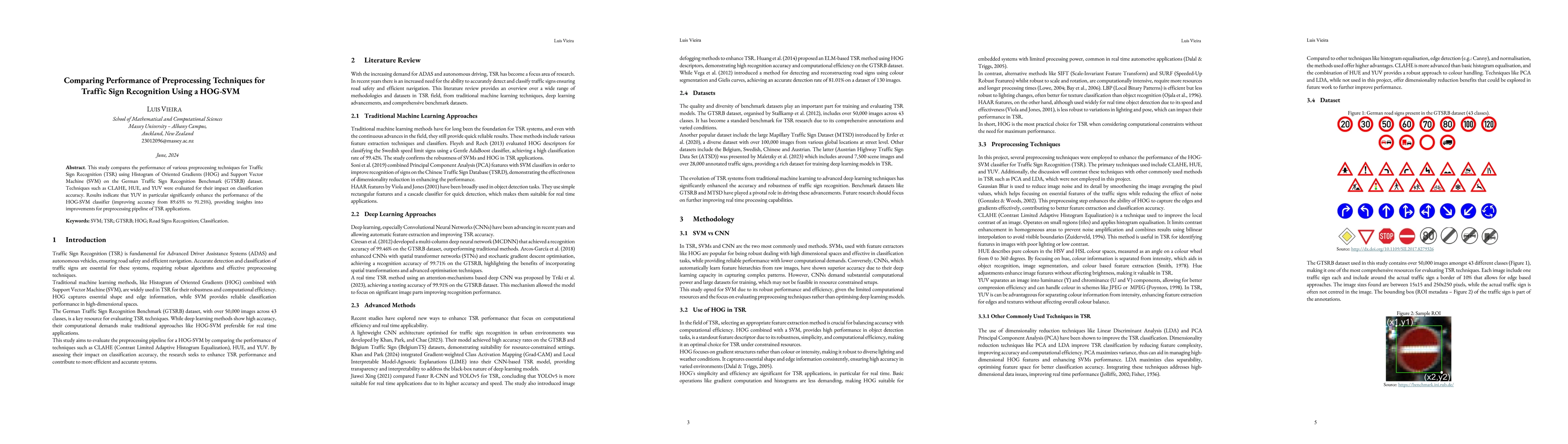 This work emphasizes the significance of preprocessing techniques in TSR using HOG-SVM, providing insights into the impact of YUV preprocessing compared to other methods like CLAHE and HUE.