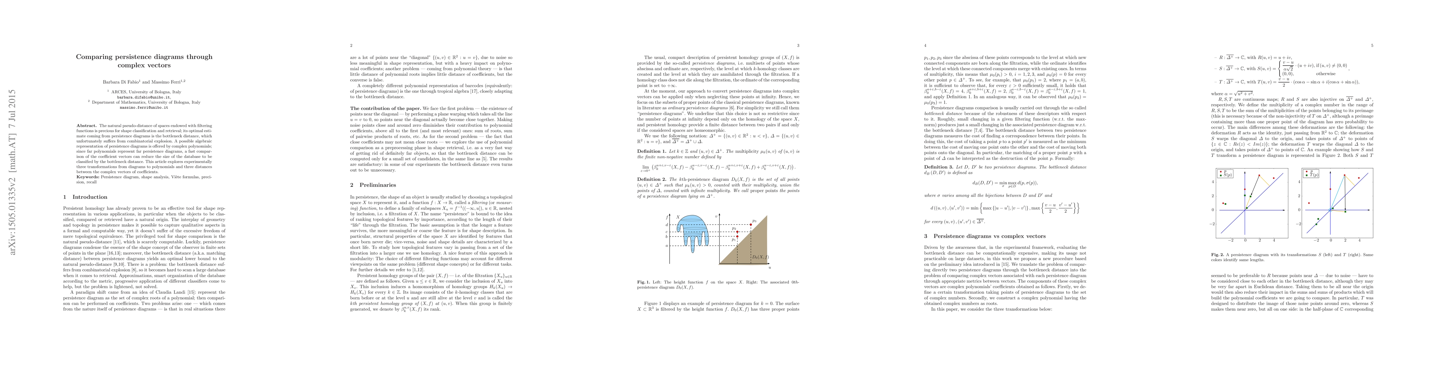 The natural pseudo-distance of spaces endowed with filtering functions is precious for shape classification and retrieval; its optimal estimate coming from persistence diagrams is the bottleneck distance, which unfortunately suffers from combinatorial explosion. A possible algebraic representation of persistence diagrams is offered by complex polynomials; since far polynomials represent far persistence diagrams, a fast comparison of the coefficient vectors can reduce the size of the database to be classified by the bottleneck distance. This article explores experimentally three transformations from diagrams to polynomials and three distances between the complex vectors of coefficients.