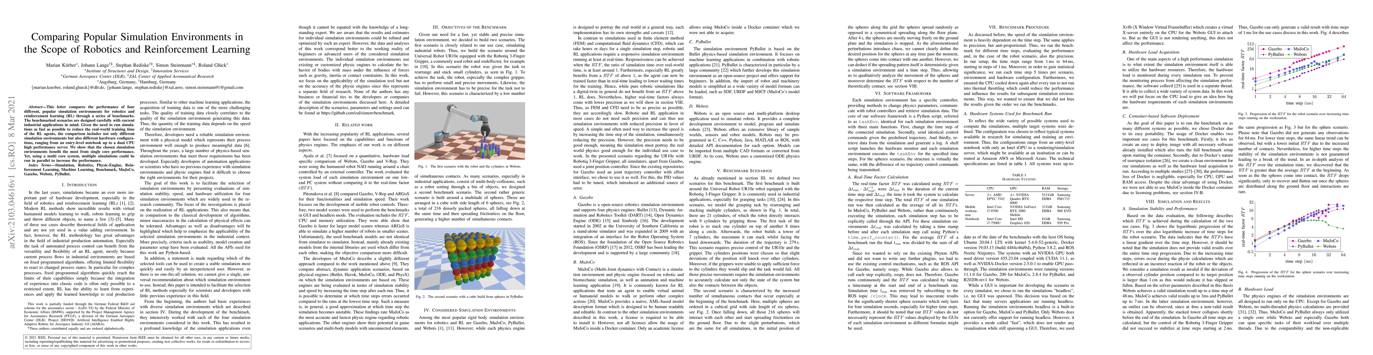 This research paper compares four popular simulation environments for robotics and reinforcement learning, finding that they perform best on single-core systems but can benefit from multi-core setups to increase performance.