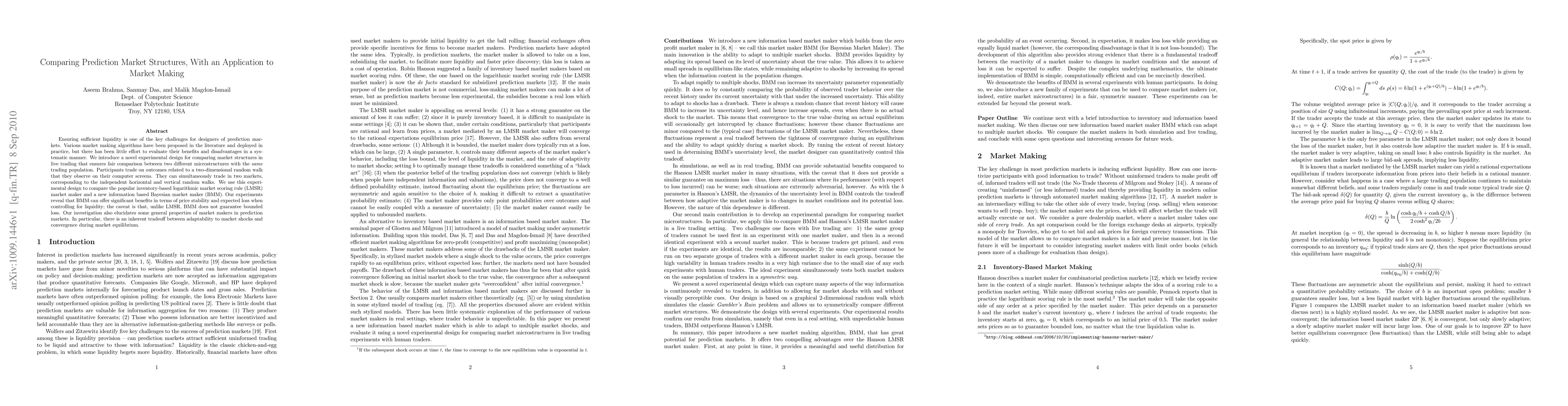 Ensuring sufficient liquidity is one of the key challenges for designers of prediction markets. Various market making algorithms have been proposed in the literature and deployed in practice, but there has been little effort to evaluate their benefits and disadvantages in a systematic manner. We introduce a novel experimental design for comparing market structures in live trading that ensures fair comparison between two different microstructures with the same trading population. Participants trade on outcomes related to a two-dimensional random walk that they observe on their computer screens. They can simultaneously trade in two markets, corresponding to the independent horizontal and vertical random walks. We use this experimental design to compare the popular inventory-based logarithmic market scoring rule (LMSR) market maker and a new information based Bayesian market maker (BMM). Our experiments reveal that BMM can offer significant benefits in terms of price stability and expected loss when controlling for liquidity; the caveat is that, unlike LMSR, BMM does not guarantee bounded loss. Our investigation also elucidates some general properties of market makers in prediction markets. In particular, there is an inherent tradeoff between adaptability to market shocks and convergence during market equilibrium.