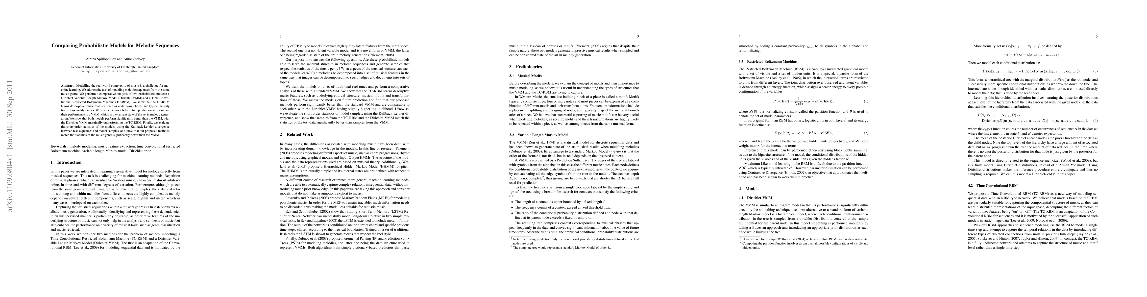 This paper compares two probabilistic models, Dirichlet-VMM and TC-RBM, for modeling melodic sequences within the same music genre. The TC-RBM outperforms the current state-of-the-art VMM in learning music features and generating melodies, with the Dirichlet-VMM slightly edging out the TC-RBM in performance.