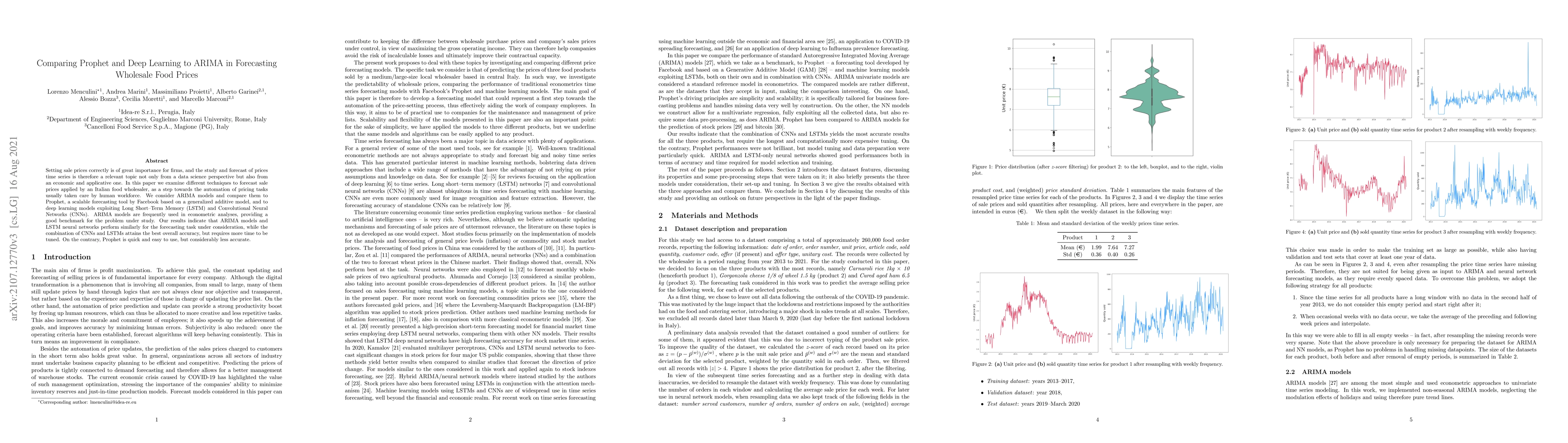 This paper compares ARIMA models with Prophet and deep learning techniques (LSTM and CNN) for forecasting wholesale food prices. Results show that ARIMA and LSTM perform similarly, while CNNs combined with LSTMs achieve the best accuracy, though Prophet is faster but less accurate.