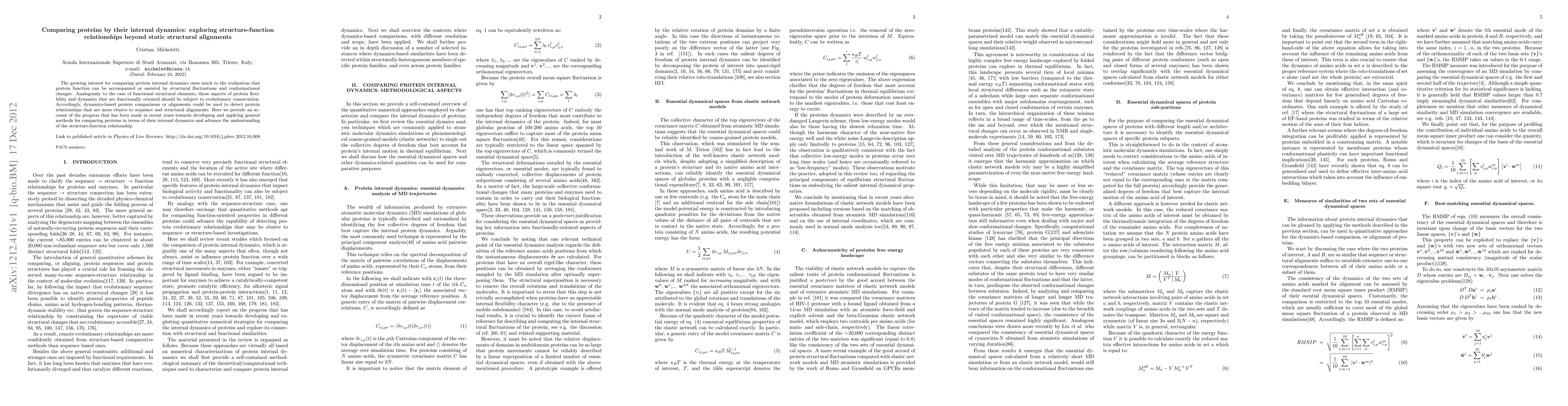 The growing interest for comparing protein internal dynamics owes much to the realization that protein function can be accompanied or assisted by structural fluctuations and conformational changes. Analogously to the case of functional structural elements, those aspects of protein flexibility and dynamics that are functionally oriented should be subject to evolutionary conservation. Accordingly, dynamics-based protein comparisons or alignments could be used to detect protein relationships that are more elusive to sequence and structural alignments. Here we provide an account of the progress that has been made in recent years towards developing and applying general methods for comparing proteins in terms of their internal dynamics and advance the understanding of the structure-function relationship.
