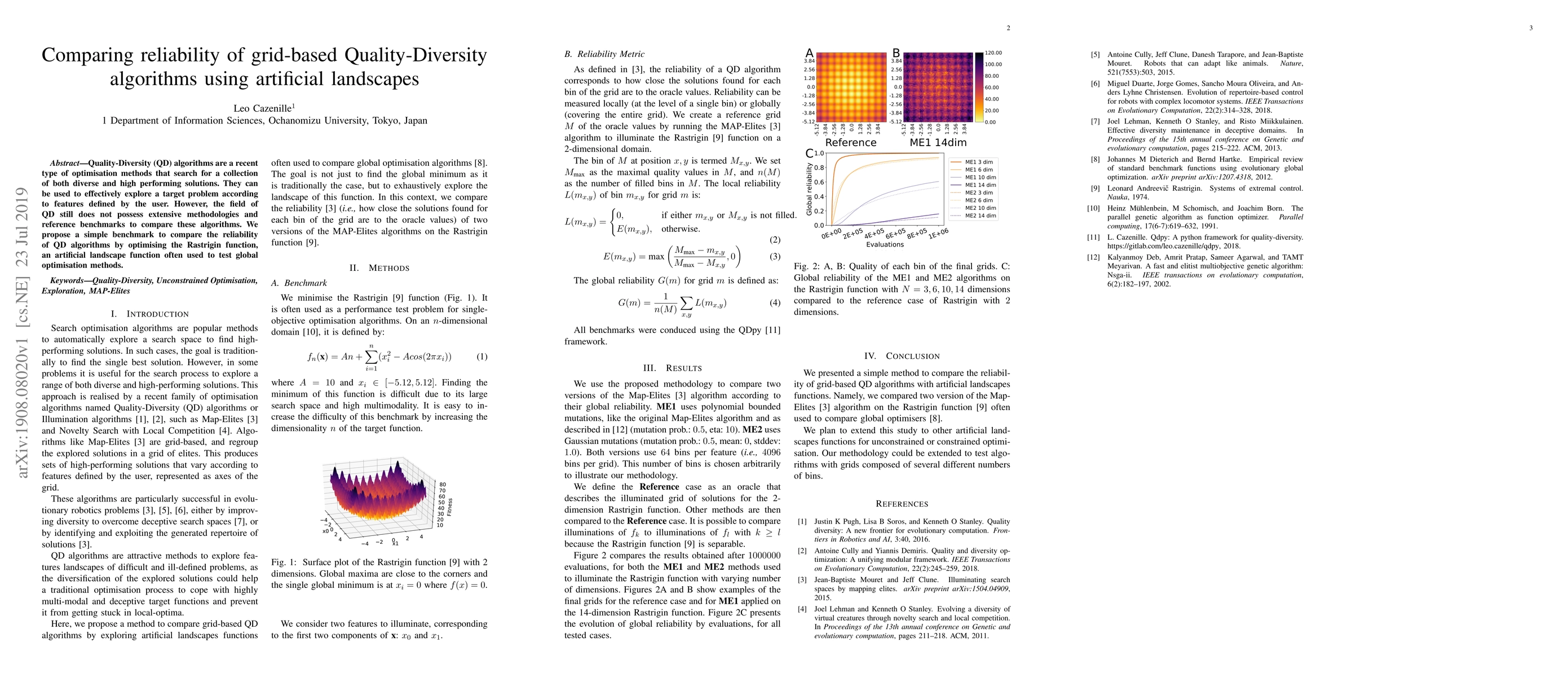 Quality-Diversity (QD) algorithms are a recent type of optimisation methods that search for a collection of both diverse and high performing solutions. They can be used to effectively explore a target problem according to features defined by the user. However, the field of QD still does not possess extensive methodologies and reference benchmarks to compare these algorithms. We propose a simple benchmark to compare the reliability of QD algorithms by optimising the Rastrigin function, an artificial landscape function often used to test global optimisation methods.