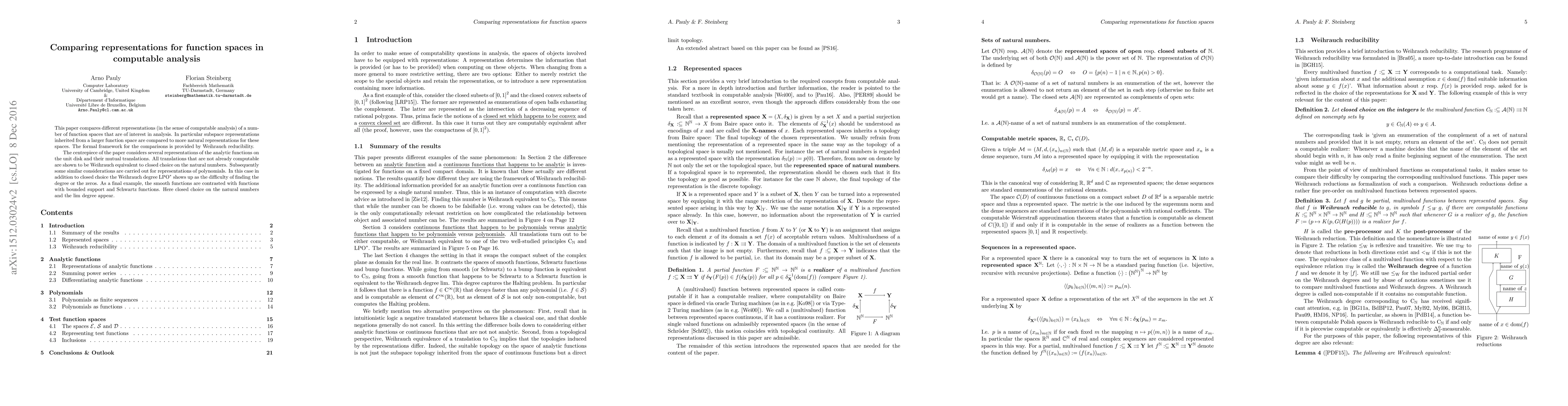 This paper evaluates various computable representations of function spaces in analysis, using Weihrauch reducibility for comparisons. It highlights the complexity of translating between representations, showing that non-computable translations often relate to closed choice on natural numbers, and discusses the difficulty of determining degrees or zeros in polynomial representations.