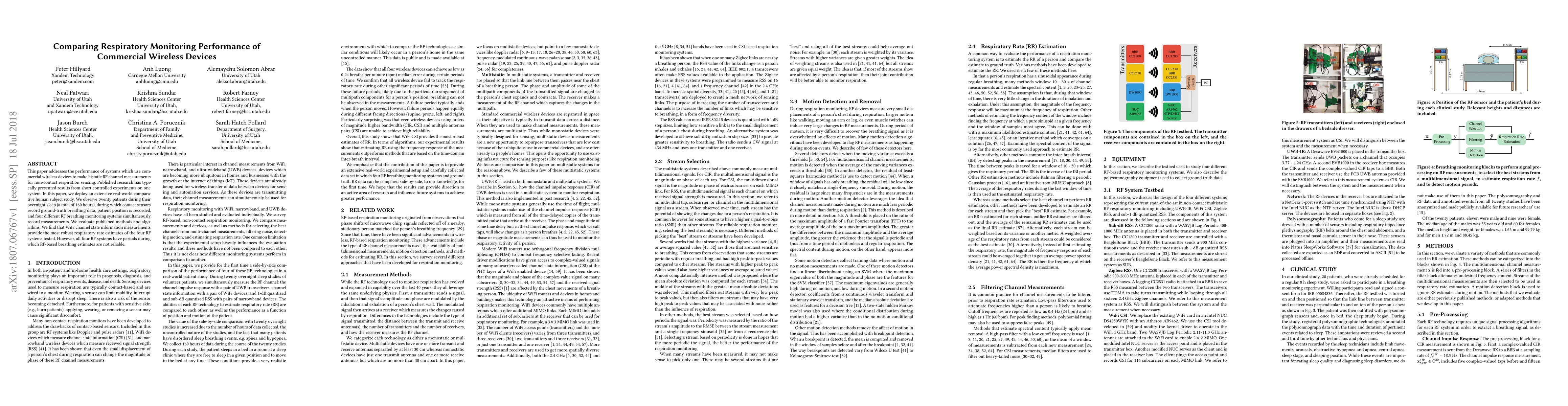 This paper compares the performance of four commercial wireless devices for non-contact respiration sensing through an extensive real-world study involving 20 patients over 160 hours. The study finds that WiFi channel state information measurements yield the most reliable respiratory rate estimates, though all tested RF systems show unreliable periods.