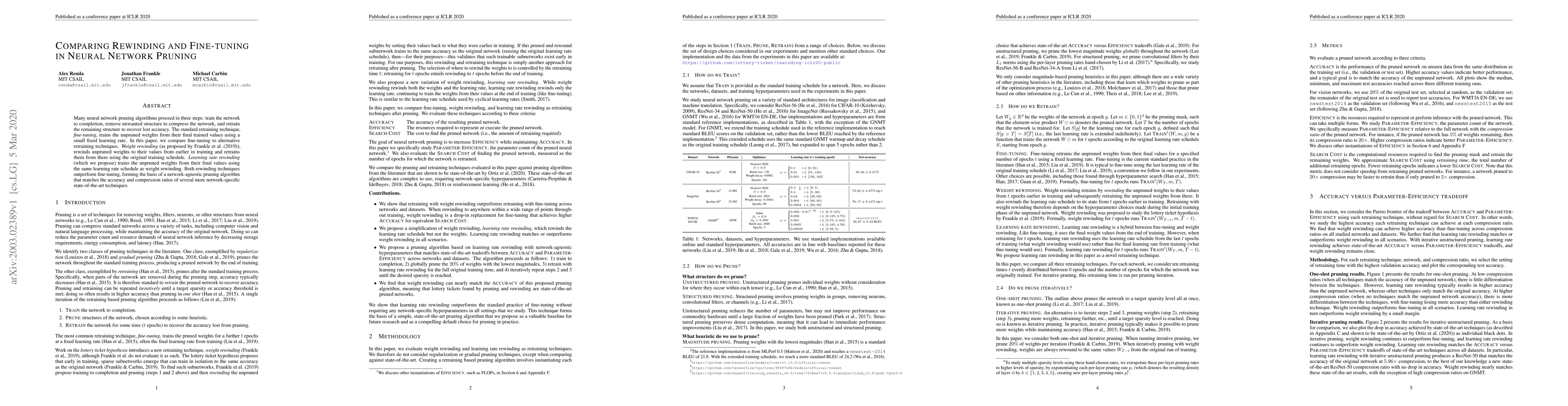 This paper compares fine-tuning with rewinding and learning rate rewinding for neural network pruning, finding that both rewinding techniques outperform fine-tuning and enable a network-agnostic pruning algorithm that achieves competitive accuracy and compression ratios.