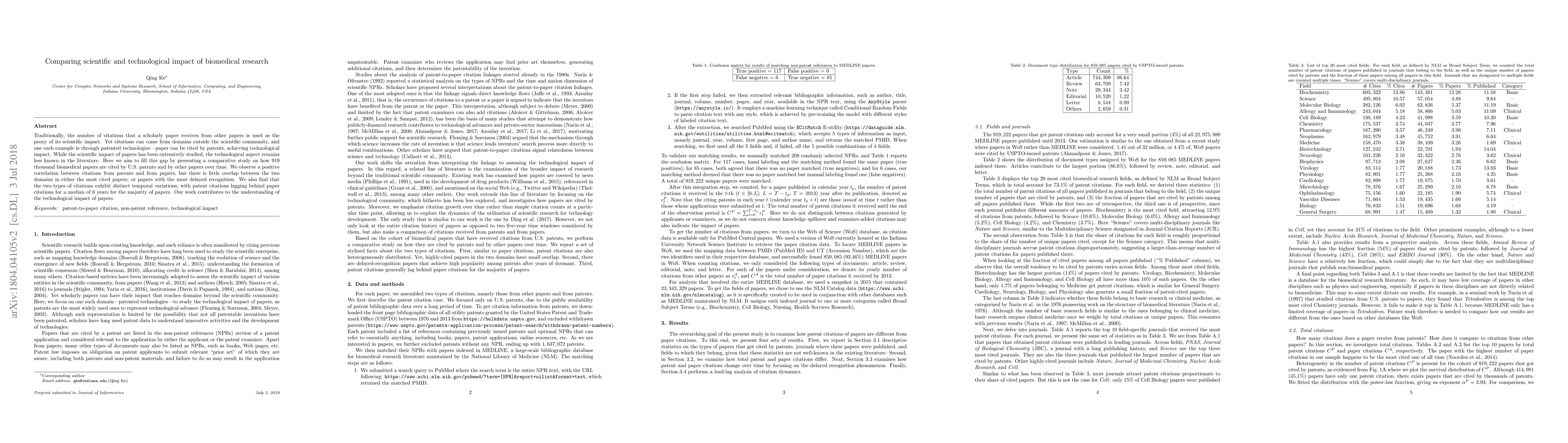 This study compares the scientific and technological impact of biomedical research by analyzing citations from both scholarly papers and U.S. patents. It finds a positive correlation between these citations but little overlap, with patent citations typically lagging behind paper citations by a median of 6 years.