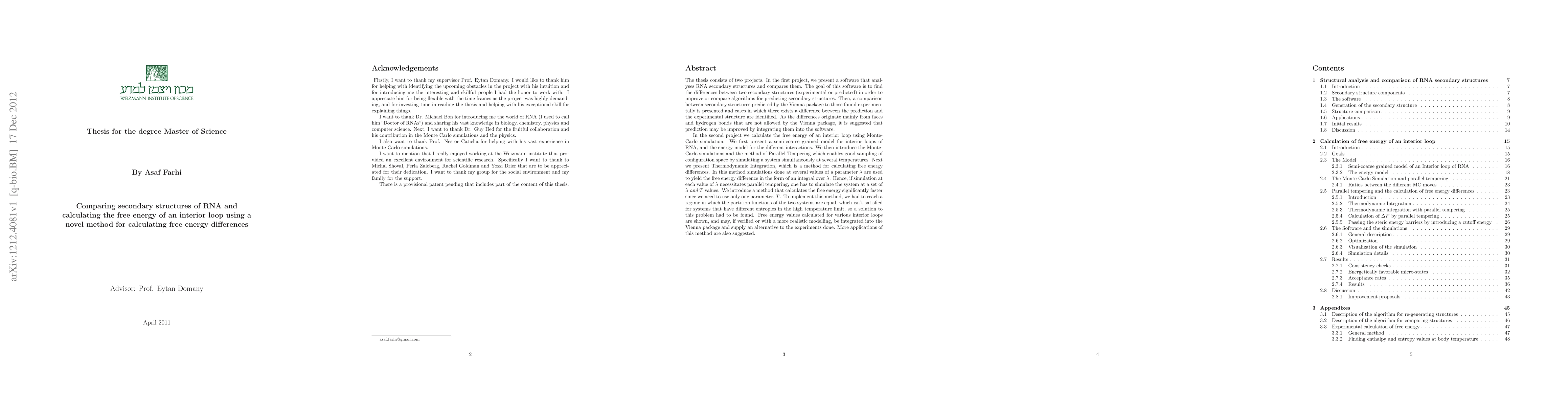The thesis consists of two projects. In the first project, we present a software that analyses RNA secondary structures and compares them. The goal of this software is to find the differences between two secondary structures (experimental or predicted) in order to improve or compare algorithms for predicting secondary structures. Then, a comparison between secondary structures predicted by the Vienna package to those found experimentally is presented and cases in which there exists a difference between the prediction and the experimental structure are identified. As the differences originate mainly from faces and hydrogen bonds that are not allowed by the Vienna package, it is suggested that prediction may be improved by integrating them into the software. In the second project we calculate the free energy of an interior loop using Monte-Carlo simulation. We first present a semi-coarse grained model for interior loops of RNA, and the energy model for the different interactions. We then introduce the Monte-Carlo simulations and the method of Parallel Tempering which enables good sampling of configuration space by simulating a system simultaneously at several temperatures. Next we present Thermodynamic Integration, which is a method for calculating free energy differences. Then, We introduce a method that calculates the free energy significantly faster since we need to use only one parameter, $T$. To implement this method, we had to reach a regime in which the partition functions of the two systems are equal, which isn't satisfied for systems that have different entropies in the high temperature limit, so a solution to this problem had to be found. Free energy values calculated for various interior loops are shown, and may, if verified or with a more realistic modelling, be integrated into the Vienna package and supply an alternative to the experiments done.