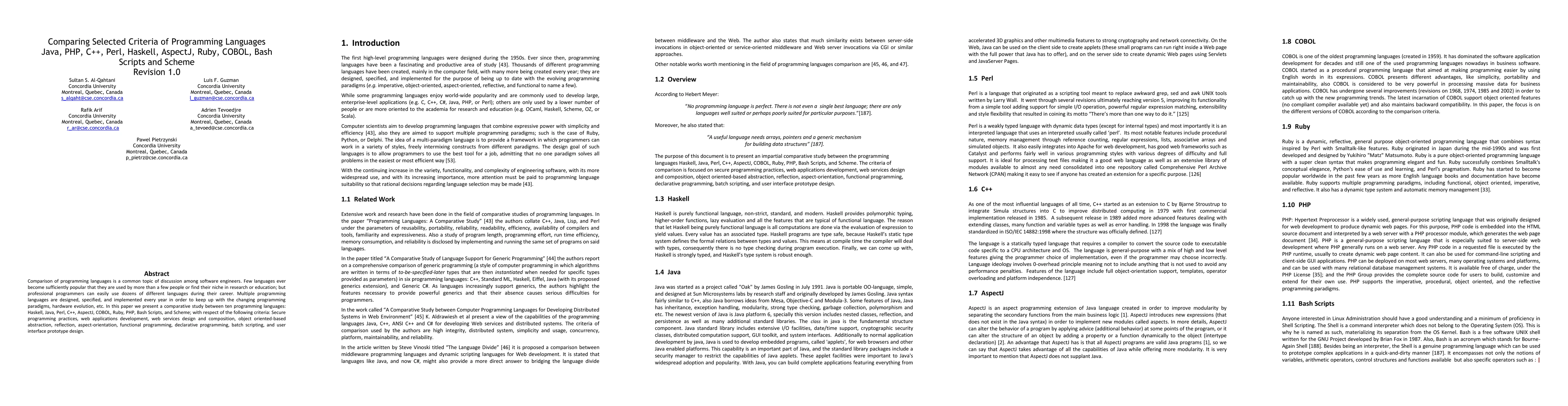 This paper conducts a comparative analysis of ten programming languages—Haskell, Java, Perl, C++, AspectJ, COBOL, Ruby, PHP, Bash Scripts, and Scheme—focusing on criteria such as secure programming, web development, object orientation, and scripting. The study aims to evaluate their suitability for various programming paradigms, hardware evolution, and educational contexts.