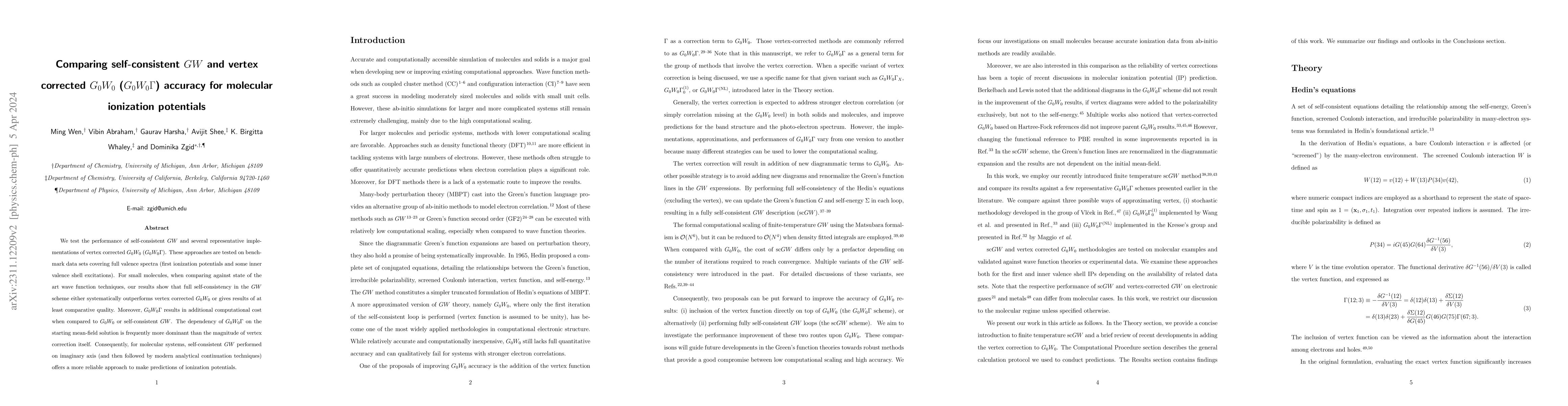 The paper presents a detailed analysis of self-consistent GW and vertex corrected G0W0 methods, highlighting their relative performance for molecular ionization potential predictions.
