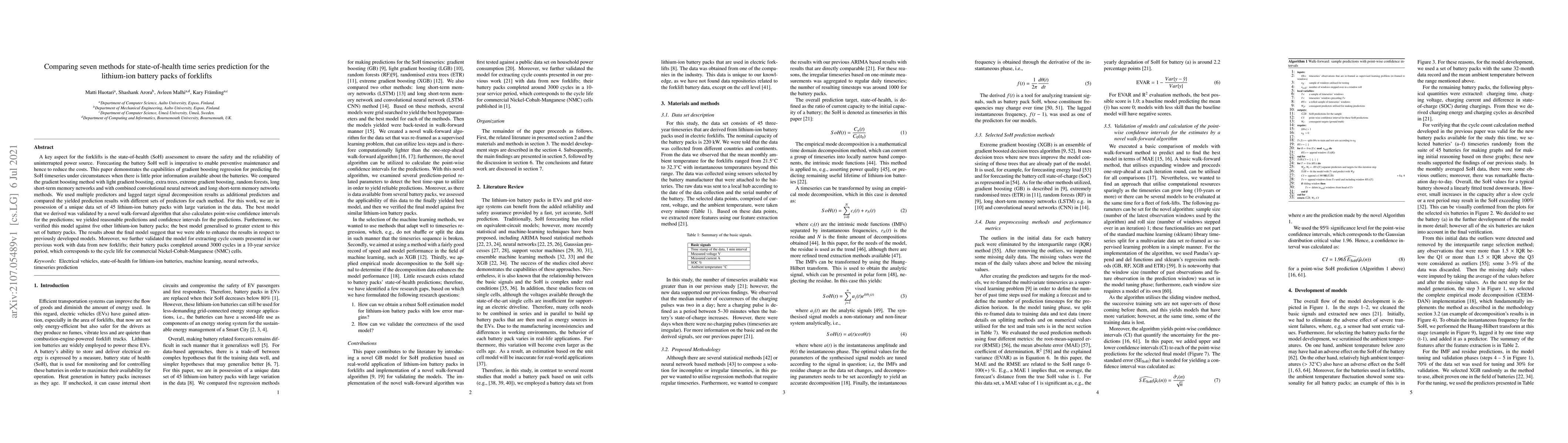 This paper compares seven methods for predicting the state-of-health (SoH) time series of lithium-ion battery packs in forklifts, finding gradient boosting regression most effective. The study validates the best model using a novel walk-forward algorithm and confirms its generalization to other battery packs.