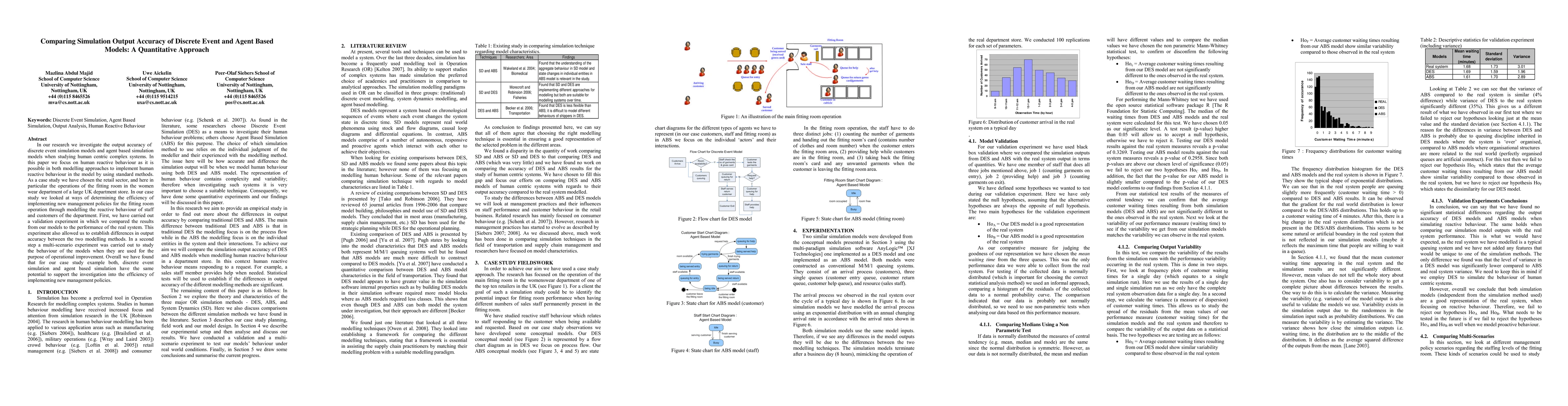 This research compares the output accuracy of discrete event and agent-based simulation models in studying human-centric complex systems, focusing on the retail sector's fitting room operations. Both models show similar potential in supporting the investigation into new management policies, with validation experiments highlighting differences in their accuracy.