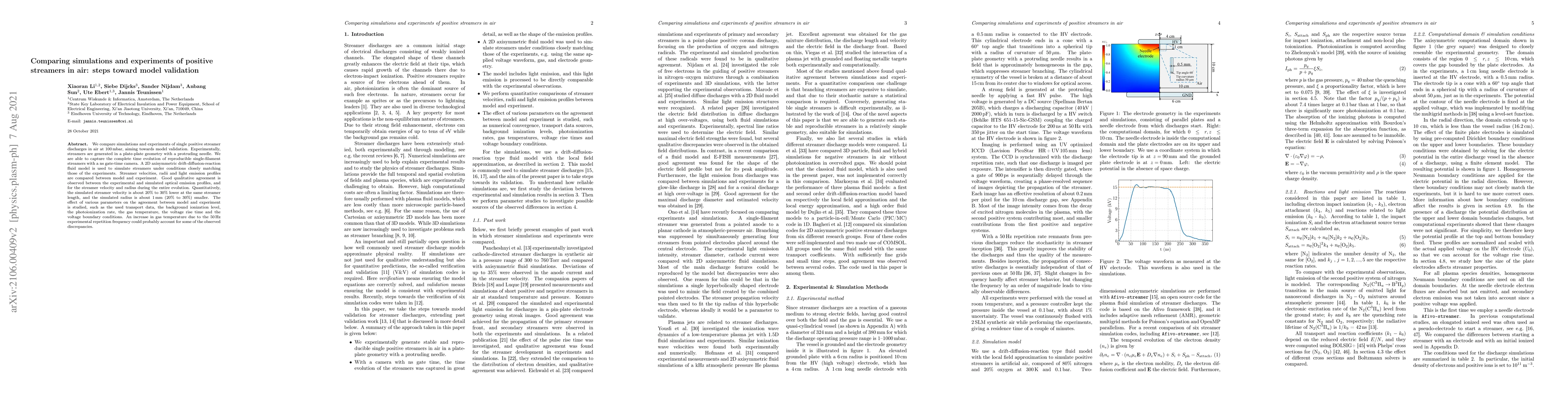 We compare simulations and experiments of single positive streamer discharges in air at 100 mbar, aiming towards model validation. Experimentally, streamers are generated in a plate-plate geometry with a protruding needle. We are able to capture the complete time evolution of reproducible single-filament streamers with a ns gate-time camera. A 2D axisymmetric drift-diffusion-reaction fluid model is used to simulate streamers under conditions closely matching those of the experiments. Streamer velocities, radii and light emission profiles are compared between model and experiment. Good qualitative agreement is observed between the experimental and simulated optical emission profiles, and for the streamer velocity and radius during the entire evolution. Quantitatively, the simulated streamer velocity is about 20% to 30% lower at the same streamer length, and the simulated radius is about 1 mm (20% to 30%) smaller. The effect of various parameters on the agreement between model and experiment is studied, such as the used transport data, the background ionization level, the photoionization rate, the gas temperature, the voltage rise time and the voltage boundary conditions. An increase in gas temperature due to the 50 Hz experimental repetition frequency could probably account for some of the observed discrepancies.