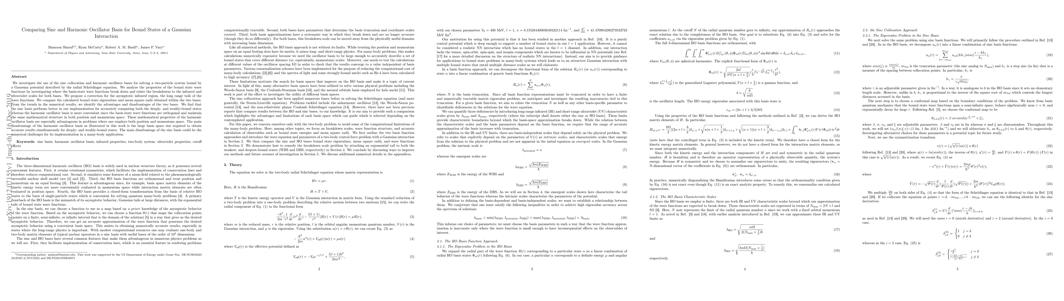 This paper compares sinc and harmonic oscillator bases for solving a two-particle system bound by a Gaussian potential, finding that the sinc basis is more accurate for both deeply- and weakly-bound states, while the harmonic oscillator basis offers mathematical convenience due to orthogonality and consistent structure in position and momentum space, though it requires a larger basis space for accurate results.