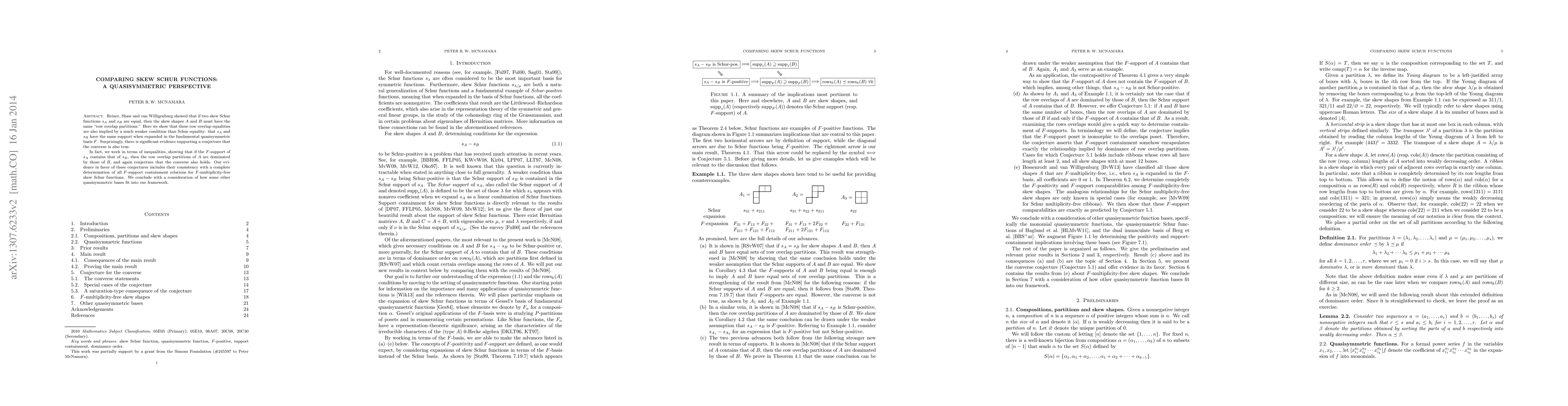 Reiner, Shaw and van Willigenburg showed that if two skew Schur functions s_A and s_B are equal, then the skew shapes A and B must have the same "row overlap partitions." Here we show that these row overlap equalities are also implied by a much weaker condition than skew Schur equality: that s_A and s_B have the same support when expanded in the fundamental quasisymmetric basis F. Surprisingly, there is significant evidence supporting a conjecture that the converse is also true. In fact, we work in terms of inequalities, showing that if the F-support of s_A contains that of s_B, then the row overlap partitions of A are dominated by those of B, and again conjecture that the converse also holds. Our evidence in favor of these conjectures includes their consistency with a complete determination of all F-support containment relations for F-multiplicity-free skew Schur functions. We conclude with a consideration of how some other quasisymmetric bases fit into our framework.