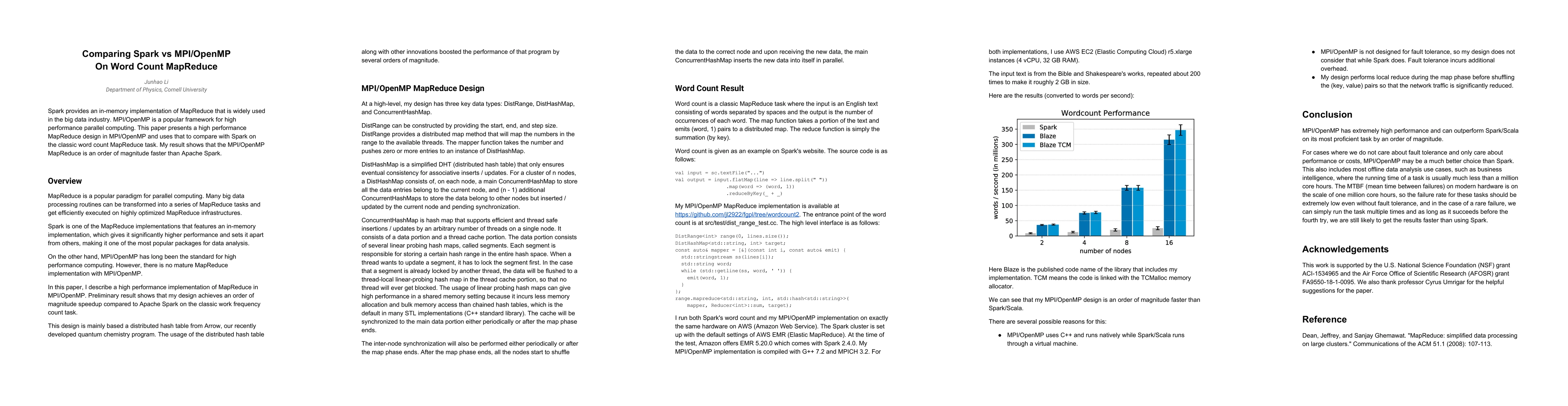 This paper compares the performance of Spark's in-memory MapReduce with a high-performance MPI/OpenMP implementation on a word count task, finding that MPI/OpenMP outperforms Spark by approximately 300%.