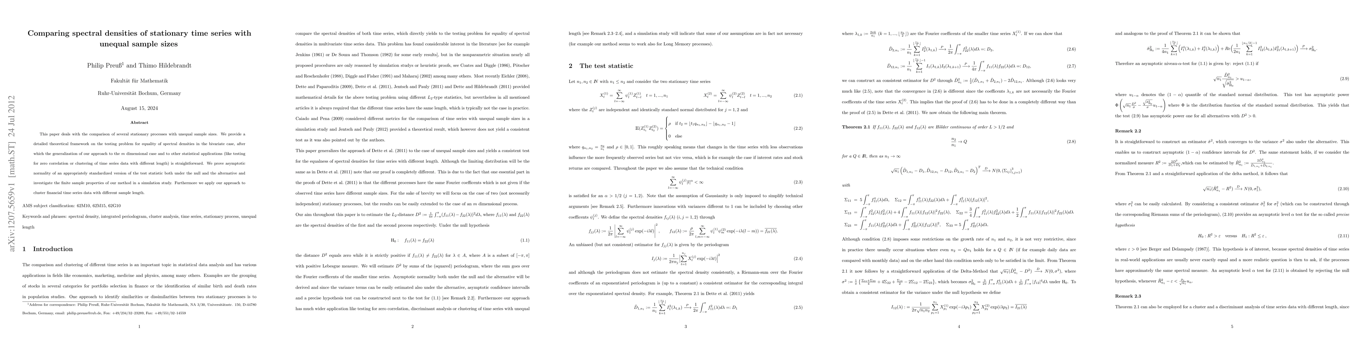This paper develops a theoretical framework for testing equality of spectral densities in stationary time series with unequal sample sizes, proving asymptotic normality and examining finite sample properties through simulations. It also applies the method to cluster financial time series data of varying lengths.