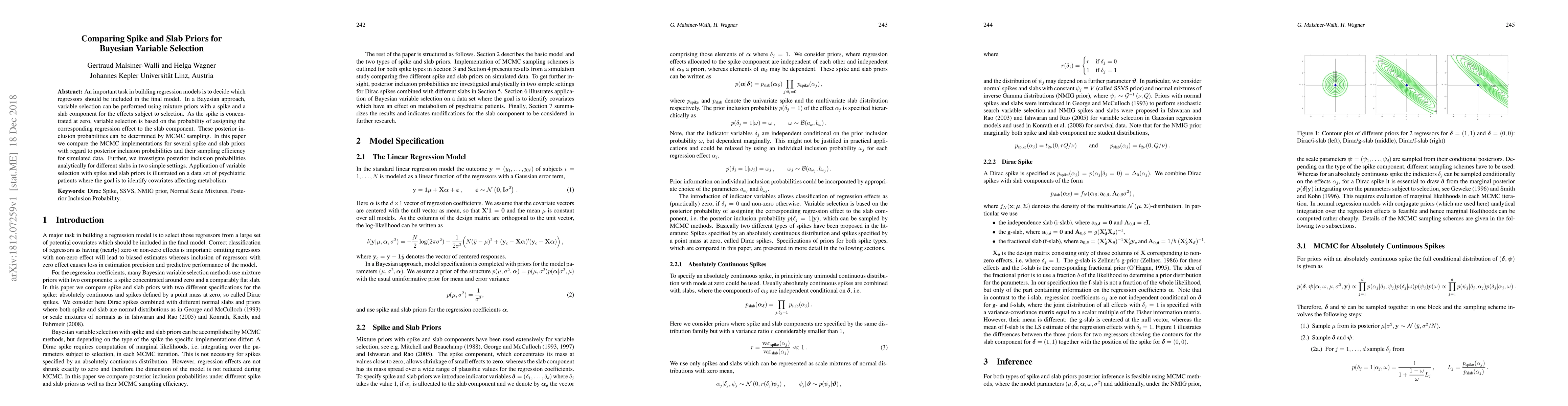 This paper compares various MCMC implementations of spike and slab priors for Bayesian variable selection, focusing on posterior inclusion probabilities and sampling efficiency. It also analyzes these probabilities analytically in simple settings and applies the method to identify metabolic covariates in psychiatric patients' data.