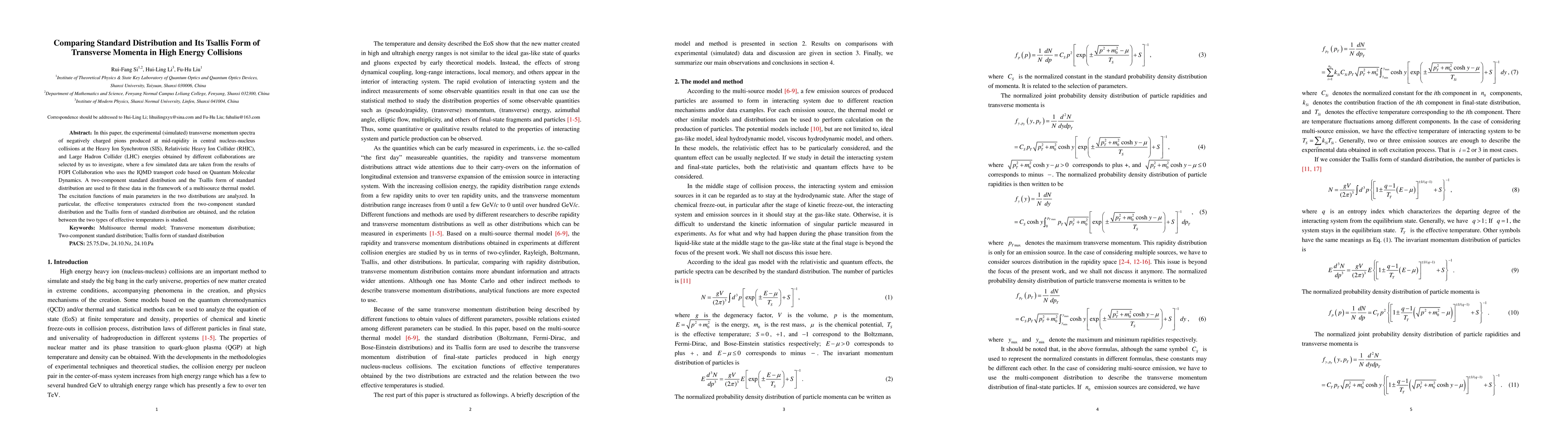 In this paper, the experimental (simulated) transverse momentum spectra of negatively charged pions produced at mid-rapidity in central nucleus-nucleus collisions at the Heavy Ion Synchrotron (SIS), Relativistic Heavy Ion Collider (RHIC), and Large Hadron Collider (LHC) energies obtained by different collaborations are selected by us to investigate, where a few simulated data are taken from the results of FOPI Collaboration who uses the IQMD transport code based on Quantum Molecular Dynamics. A two-component standard distribution and the Tsallis form of standard distribution are used to fit these data in the framework of a multisource thermal model. The excitation functions of main parameters in the two distributions are analyzed. In particular, the effective temperatures extracted from the two-component standard distribution and the Tsallis form of standard distribution are obtained, and the relation between the two types of effective temperatures is studied.