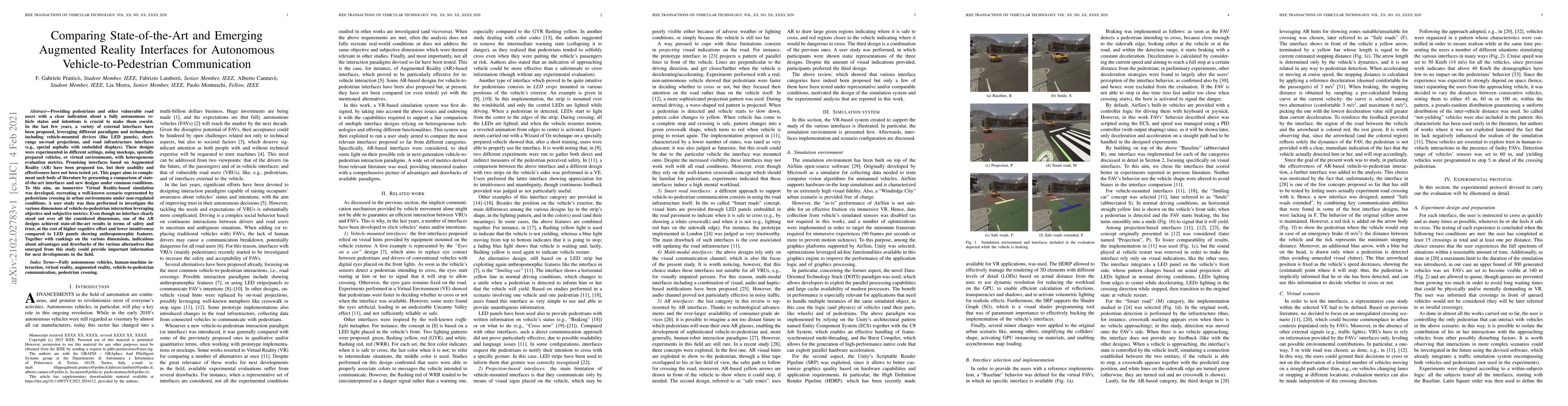 This paper compares state-of-the-art and emerging Augmented Reality interfaces for autonomous vehicle-to-pedestrian communication, finding that while no single interface excels across all metrics, an AR design showed the best safety and trust results, albeit with higher cognitive effort and lower intuitiveness compared to traditional LED panels.