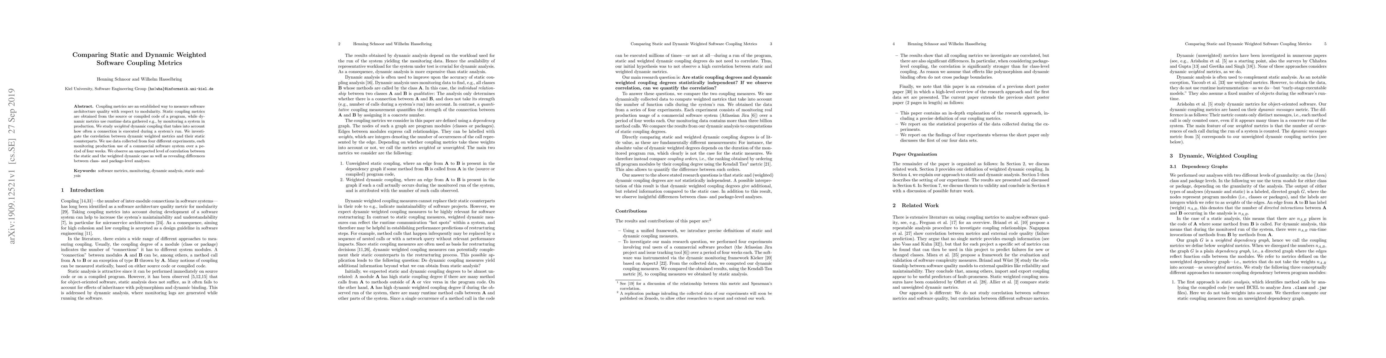 Coupling metrics are an established way to measure software architecture quality with respect to modularity. Static coupling metrics are obtained from the source or compiled code of a program, while dynamic metrics use runtime data gathered e.g., by monitoring a system in production. We study \emph{weighted} dynamic coupling that takes into account how often a connection is executed during a system's run. We investigate the correlation between dynamic weighted metrics and their static counterparts. We use data collected from four different experiments, each monitoring production use of a commercial software system over a period of four weeks. We observe an unexpected level of correlation between the static and the weighted dynamic case as well as revealing differences between class- and package-level analyses.