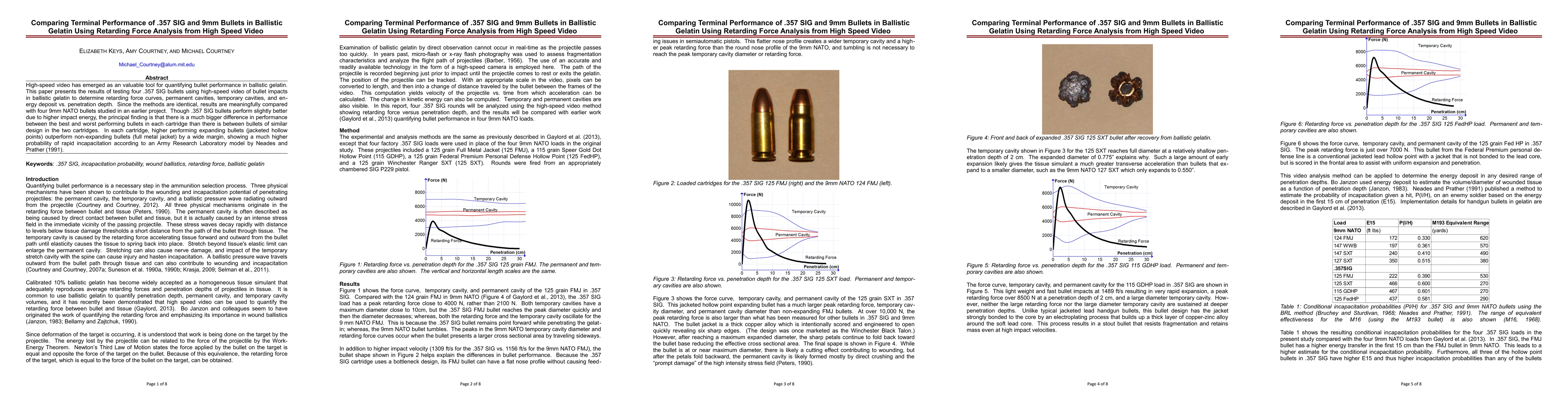High-speed video has emerged as an valuable tool for quantifying bullet performance in ballistic gelatin. This paper presents the results of testing four .357 SIG bullets using high-speed video of bullet impacts in ballistic gelatin to determine retarding force curves, permanent cavities, temporary cavities, and energy deposit vs. penetration depth. Since the methods are identical, results are meaningfully compared with four 9mm NATO bullets studied in an earlier project. Though .357 SIG bullets perform slightly better due to higher impact energy, the principal finding is that there is a much bigger difference in performance between the best and worst performing bullets in each cartridge than there is between bullets of similar design in the two cartridges. In each cartridge, higher performing expanding bullets (jacketed hollow points) outperform non-expanding bullets (full metal jacket) by a wide margin, showing a much higher probability of rapid incapacitation according to an Army Research Laboratory model by Neades and Prather (1991).
