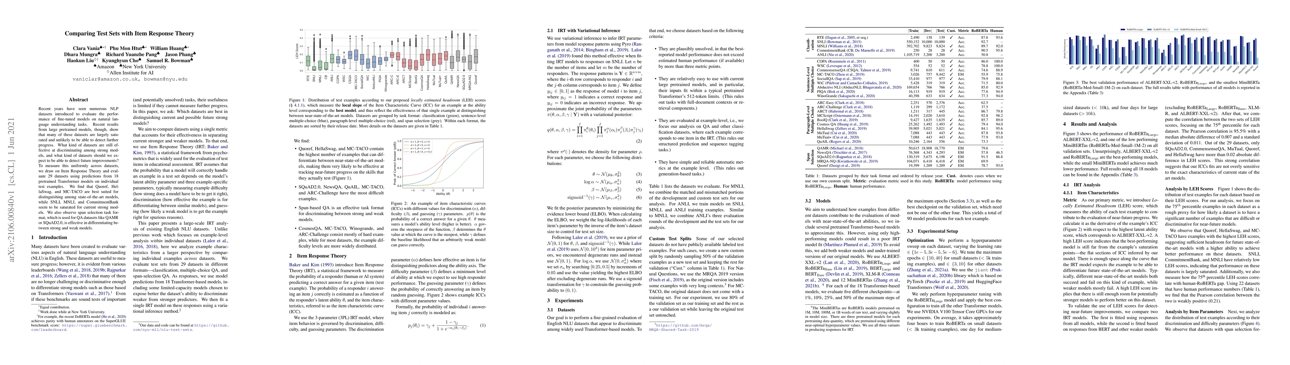 This paper uses Item Response Theory to evaluate 29 NLP datasets, finding that Quoref, HellaSwag, and MC-TACO are most effective at distinguishing among state-of-the-art models, while SNLI, MNLI, and CommitmentBank appear saturated. The study also highlights the effectiveness of span selection tasks in differentiating strong models.