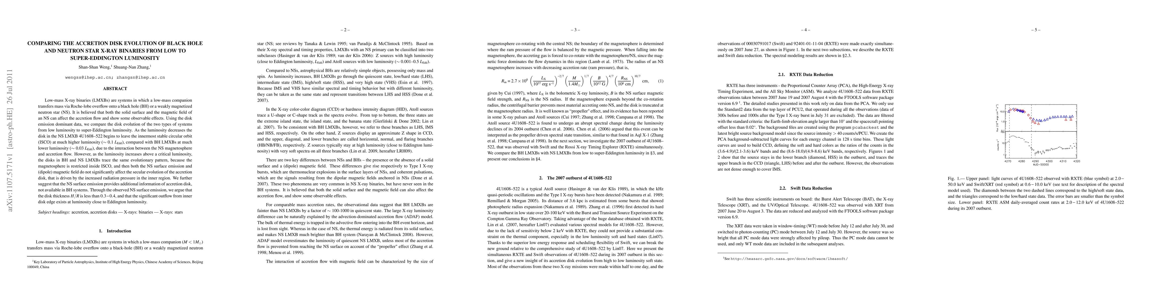 Low-mass X-ray binaries (LMXBs) are systems in which a low-mass companion transfers mass via Roche-lobe overflow onto a black hole (BH) or a weakly magnetized neutron star (NS). It is believed that both the solid surface and the magnetic field of an NS can affect the accretion flow and show some observable effects. Using the disk emission dominant data, we compare the disk evolution of the two types of systems from low luminosity to super-Eddington luminosity. As the luminosity decreases the disk in the NS LMXB 4U1608--522 begins to leave the innermost stable circular orbit (ISCO) at much higher luminosity ($\sim$ 0.1 $L_{\mathrm{Edd}}$), compared with BH LMXBs at much lower luminosity ($\sim$ 0.03 $L_{\mathrm{Edd}}$), due to the interaction between the NS magnetosphere and accretion flow. However, as the luminosity increases above a critical luminosity, the disks in BH and NS LMXBs trace the same evolutionary pattern, because the magnetosphere is restricted inside ISCO, and then both the NS surface emission and (dipole) magnetic field do not significantly affect the secular evolution of the accretion disk, that is driven by the increased radiation pressure in the inner region. We further suggest that the NS surface emission provides additional information of accretion disk, not available in BH systems. Through the observed NS surface emission, we argue that the disk thickness $H/R$ is less than $0.3-0.4$, and that the significant outflow from inner disk edge exists at luminosity close to Eddington luminosity.