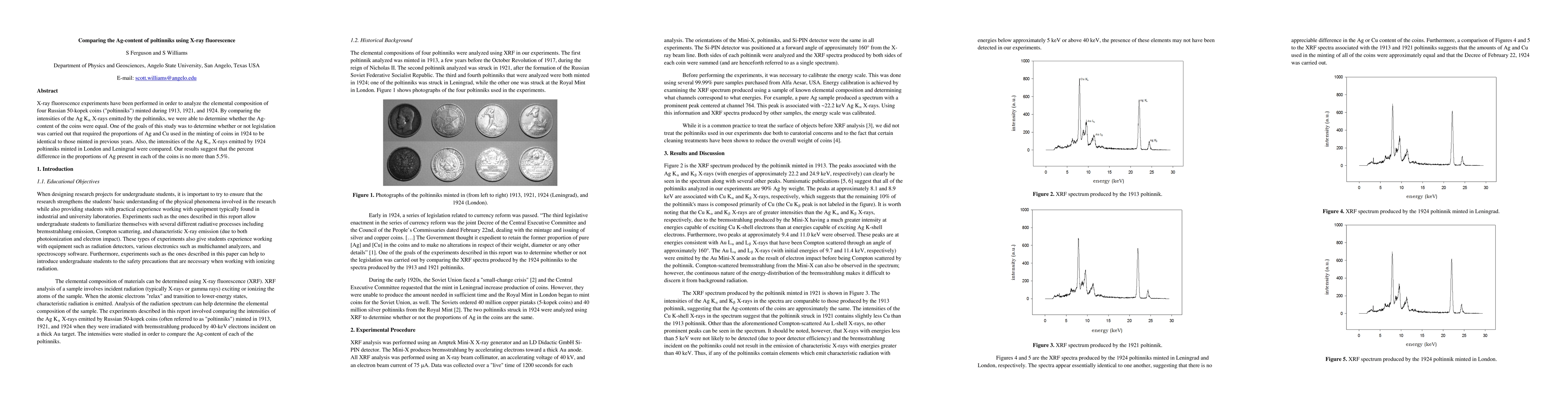 X-ray fluorescence experiments have been performed in order to analyze the elemental composition of four Russian 50-kopek coins ("poltinniks") minted during 1913, 1921, and 1924. By comparing the intensities of the Ag K{\alpha} X-rays emitted by the poltinniks, we were able to determine whether the Ag-content of the coins were equal. One of the goals of this study was to determine whether or not legislation was carried out that required the proportions of Ag and Cu used in the minting of coins in 1924 to be identical to those minted in previous years. Also, the intensities of the Ag K{\alpha} X-rays emitted by 1924 poltinniks minted in London and Leningrad were compared. Our results suggest that the percent difference in the proportions of Ag present in each of the coins is no more than 5.5%.