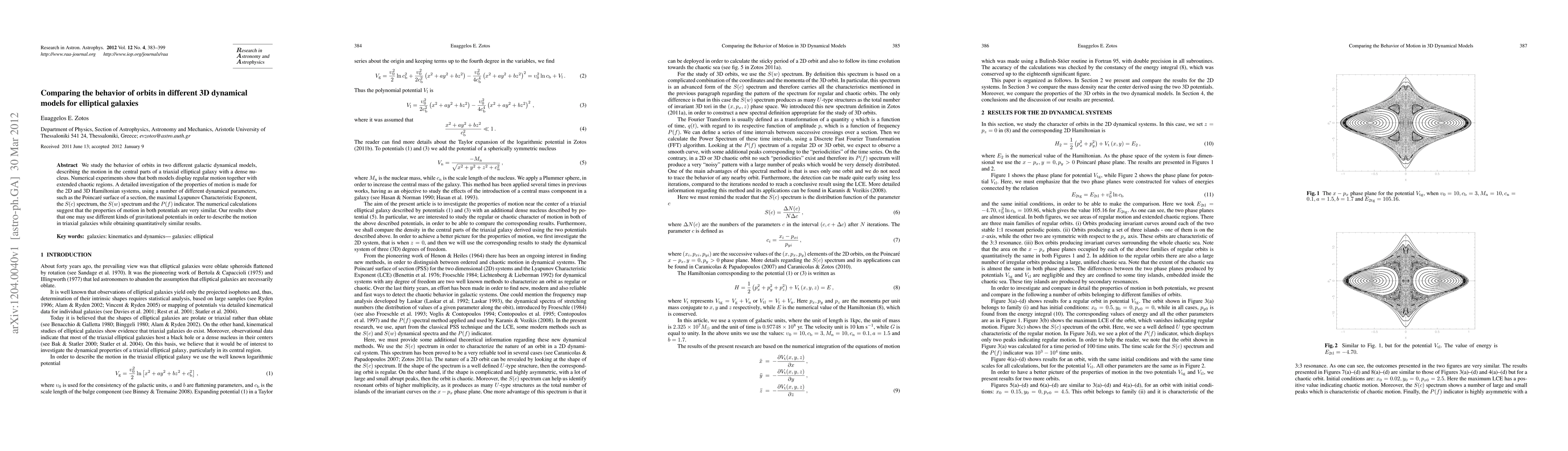 We study the behavior of orbits in two different galactic dynamical models, describing the motion in the central parts of a triaxial elliptical galaxy with a dense nucleus. Numerical experiments show that both models display regular motion together with extended chaotic regions. A detailed investigation of the properties of motion is made for the 2D and 3D Hamiltonian systems, using a number of different dynamical parameters, such as the Poincare surface of section, the maximal Lyapunov Characteristic Exponent, the S(c) spectrum, the S(w) spectrum and the P(f) indicator. The numerical calculations suggest that the properties of motion in both potentials are very similar. Our results show that one may use different kinds of gravitational potentials in order to describe the motion in triaxial galaxies while obtaining quantitatively similar results.