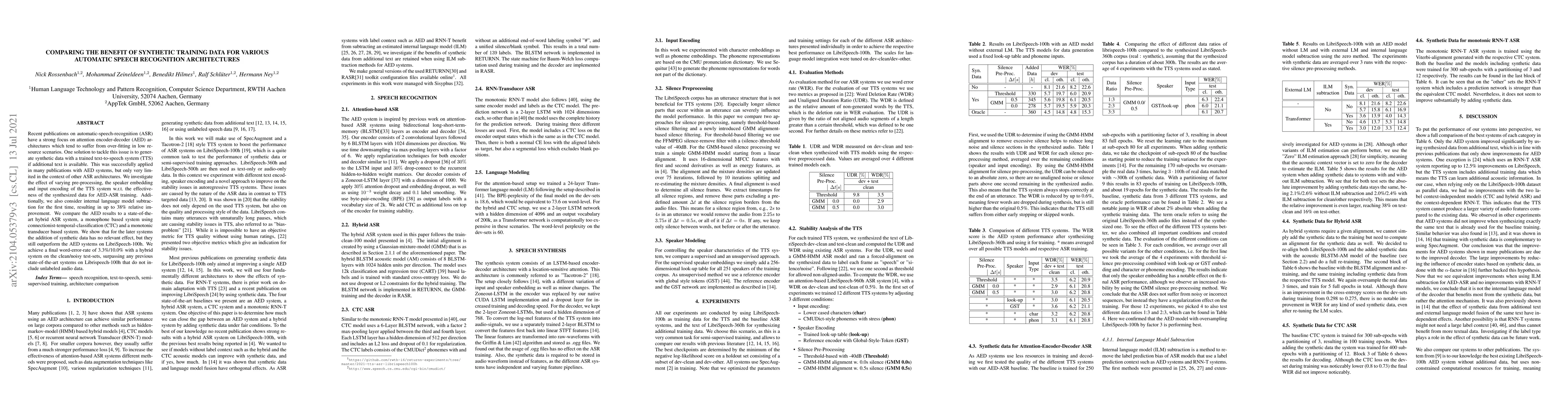 This paper investigates the impact of synthetic training data generated by a text-to-speech system on various automatic speech recognition architectures, showing significant improvements for attention encoder-decoder systems but negligible effects for other architectures like hybrid, CTC, and monotonic transducer systems. The study achieves state-of-the-art results on LibriSpeech-100h with a hybrid system.