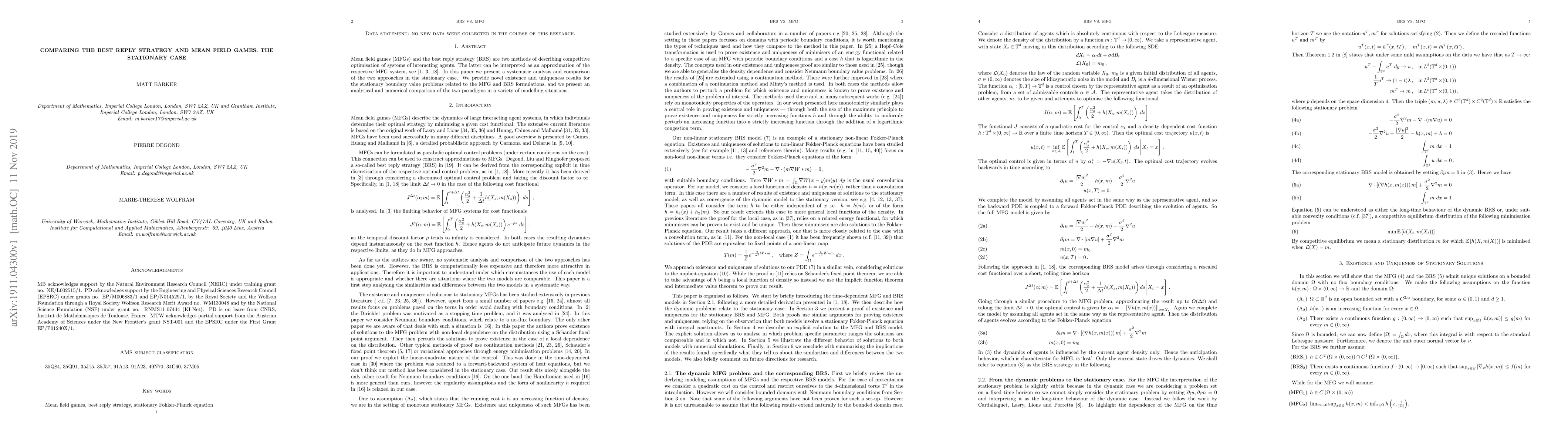 Mean field games (MFGs) and the best reply strategy (BRS) are two methods of describing competitive optimisation of systems of interacting agents. The latter can be interpreted as an approximation of the respective MFG system. In this paper we present a systematic analysis and comparison of the two approaches in the stationary case. We provide novel existence and uniqueness results for the stationary boundary value problems related to the MFG and BRS formulations, and we present an analytical and numerical comparison of the two paradigms in a variety of modelling situations.