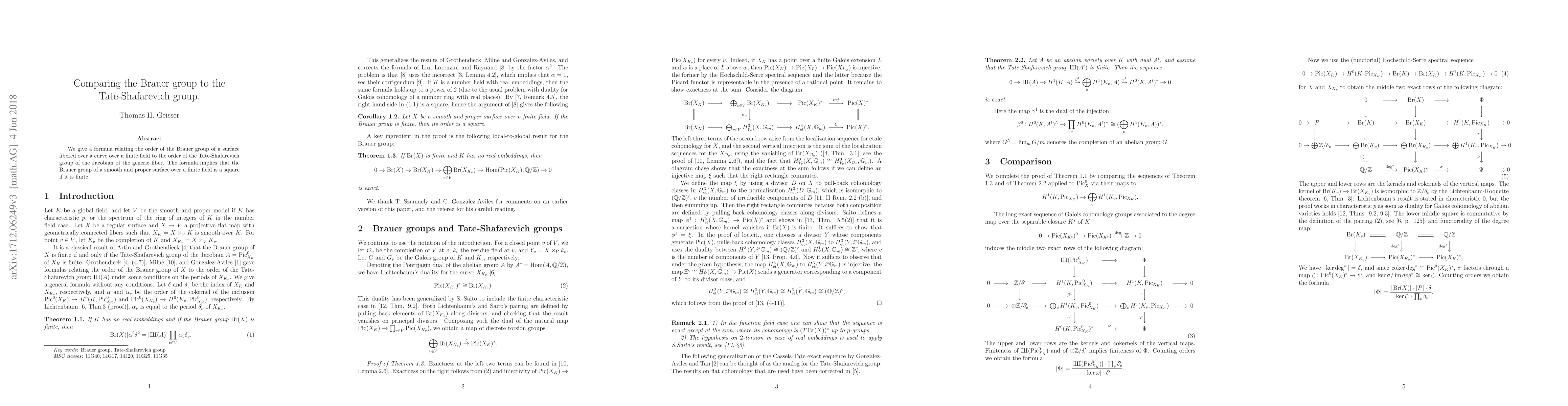This paper establishes a formula linking the order of the Brauer group of a surface over a finite field to the Tate-Shafarevich group of the Jacobian of its generic fiber, showing that the Brauer group is a square if finite.