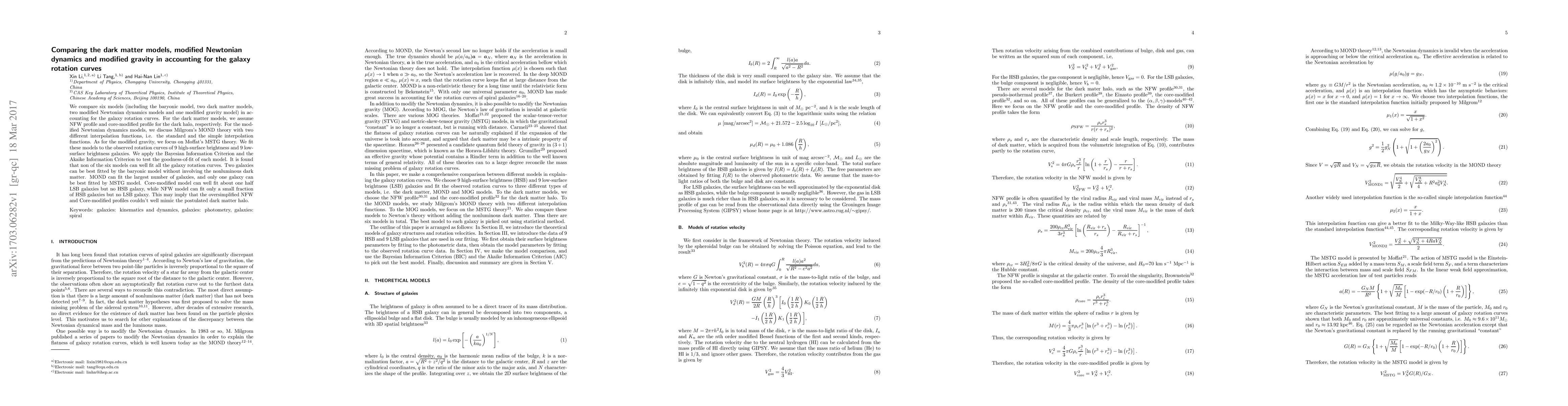 We compare six models (including the baryonic model, two dark matter models, two modified Newtonian dynamics models and one modified gravity model) in accounting for the galaxy rotation curves. For the dark matter models, we assume NFW profile and core-modified profile for the dark halo, respectively. For the modified Newtonian dynamics models, we discuss Milgrom's MOND theory with two different interpolation functions, i.e. the standard and the simple interpolation functions. As for the modified gravity, we focus on Moffat's MSTG theory. We fit these models to the observed rotation curves of 9 high-surface brightness and 9 low-surface brightness galaxies. We apply the Bayesian Information Criterion and the Akaike Information Criterion to test the goodness-of-fit of each model. It is found that non of the six models can well fit all the galaxy rotation curves. Two galaxies can be best fitted by the baryonic model without involving the nonluminous dark matter. MOND can fit the largest number of galaxies, and only one galaxy can be best fitted by MSTG model. Core-modified model can well fit about one half LSB galaxies but no HSB galaxy, while NFW model can fit only a small fraction of HSB galaxies but no LSB galaxy. This may imply that the oversimplified NFW and Core-modified profiles couldn't well mimic the postulated dark matter halo.