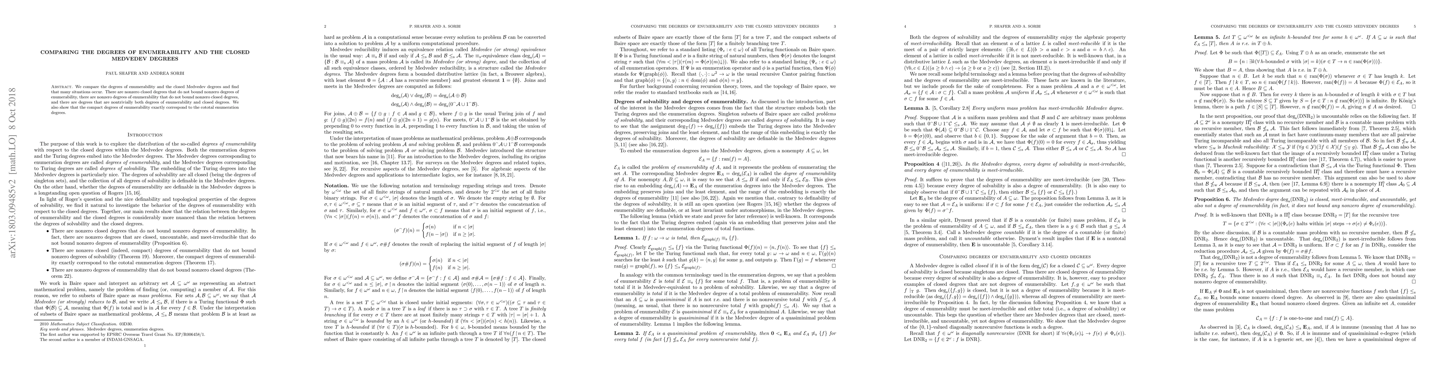 We compare the degrees of enumerability and the closed Medvedev degrees and find that many situations occur. There are nonzero closed degrees that do not bound nonzero degrees of enumerability, there are nonzero degrees of enumerability that do not bound nonzero closed degrees, and there are degrees that are nontrivially both degrees of enumerability and closed degrees. We also show that the compact degrees of enumerability exactly correspond to the cototal enumeration degrees.