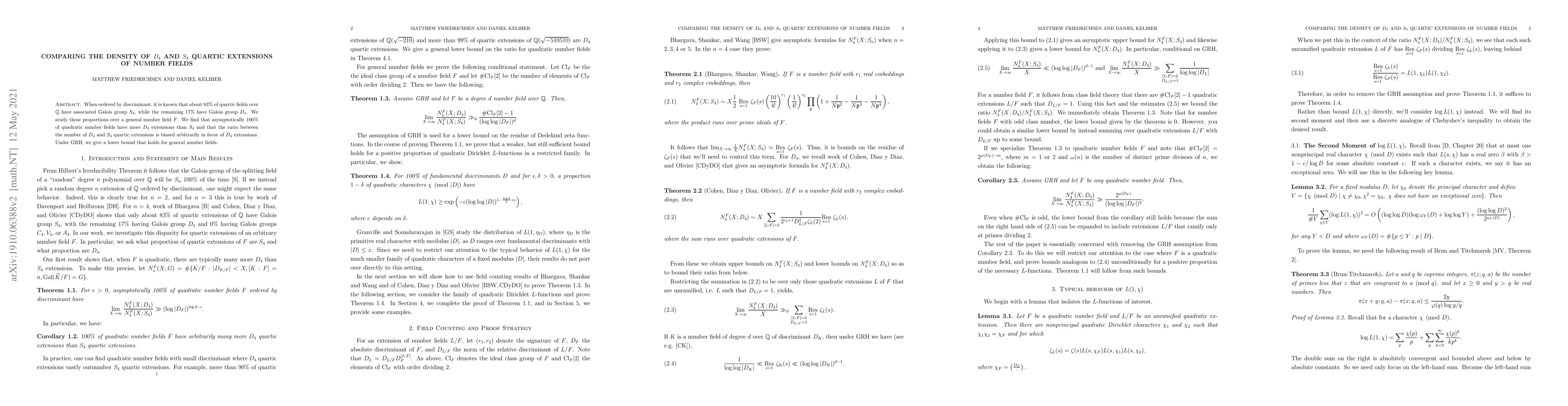 This research compares the density of quartic extensions of number fields with Galois groups D_4 and S_4, finding that D_4 extensions dominate asymptotically. Under the Generalized Riemann Hypothesis, a lower bound favoring D_4 extensions is established for general number fields.