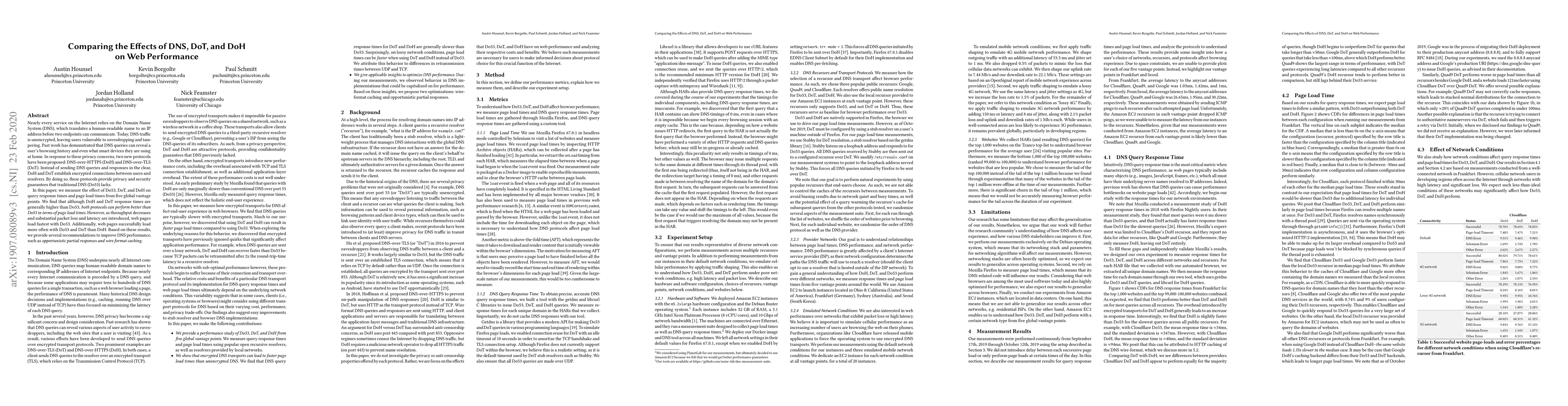 This paper compares the performance of traditional DNS, DNS-over-TLS (DoT), and DNS-over-HTTPS (DoH) in terms of query response times and page load times. While DoH and DoT offer enhanced privacy, they generally result in higher response times compared to traditional DNS, though they can outperform it in page load times under certain conditions. The study recommends strategies like opportunistic partial responses and wire format caching to improve DNS performance.