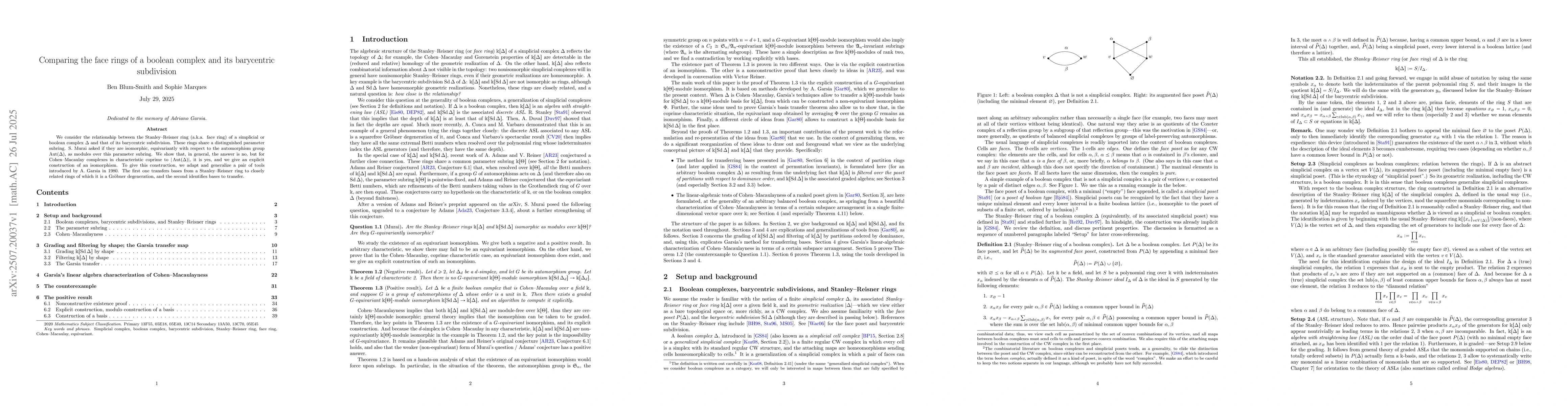 We consider the relationship between the Stanley-Reisner ring (a.k.a. face ring) of a simplicial or boolean complex $\Delta$ and that of its barycentric subdivision. These rings share a distinguished parameter subring. S. Murai asked if they are isomorphic, equivariantly with respect to the automorphism group $\operatorname{Aut}(\Delta)$, as modules over this parameter subring. We show that, in general, the answer is no, but for Cohen-Macaulay complexes in characteristic coprime to $|\operatorname{Aut}(\Delta)|$, it is yes, and we give an explicit construction of an isomorphism. To give this construction, we adapt and generalize a pair of tools introduced by A. Garsia in 1980. The first one transfers bases from a Stanley-Reisner ring to closely related rings of which it is a Gr\"obner degeneration, and the second identifies bases to transfer.