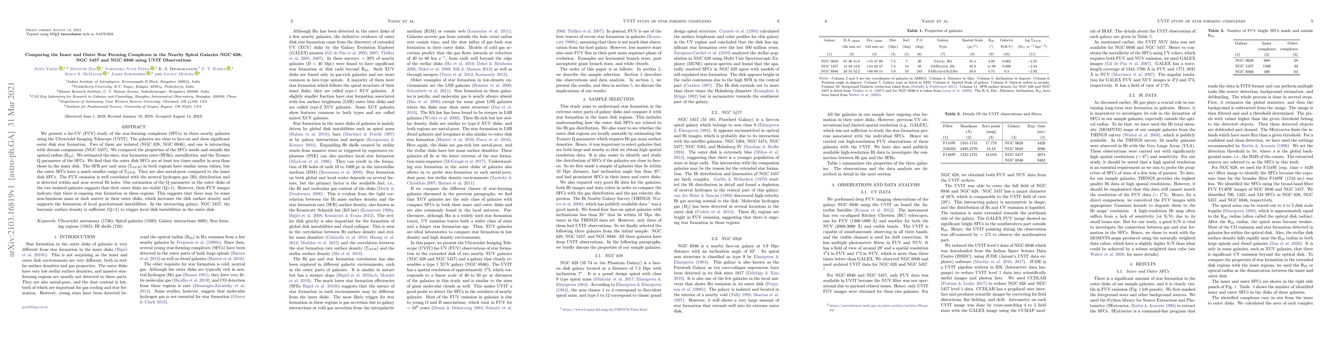 This study uses UVIT observations to compare the star-forming complexes in the inner and outer disks of three nearby spiral galaxies, finding that outer SFCs are smaller, less metallic, and have stable Toomre Q parameters despite ongoing star formation, suggesting the presence of dark matter. In the interacting galaxy, local disk instabilities are triggered by sufficient baryonic density.