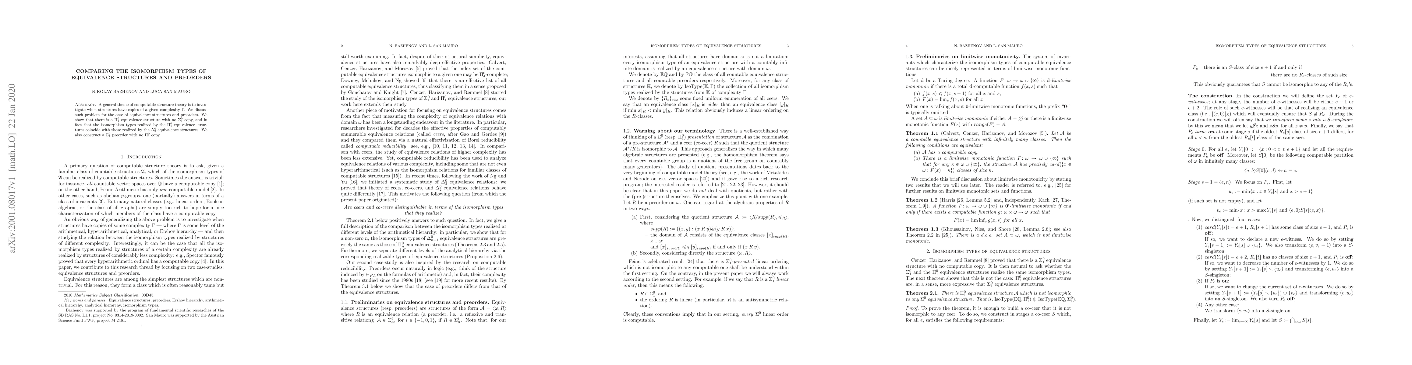This paper investigates the isomorphism types of equivalence structures and preorders within computable structure theory, demonstrating that $\Pi^0_1$ equivalence structures lack $\Sigma^0_1$ copies and that $\Pi^0_1$ and $\Delta^0_2$ equivalence structures share the same isomorphism types. Additionally, a $\Sigma^0_1$ preorder is shown to have no $\Pi^0_1$ copy.