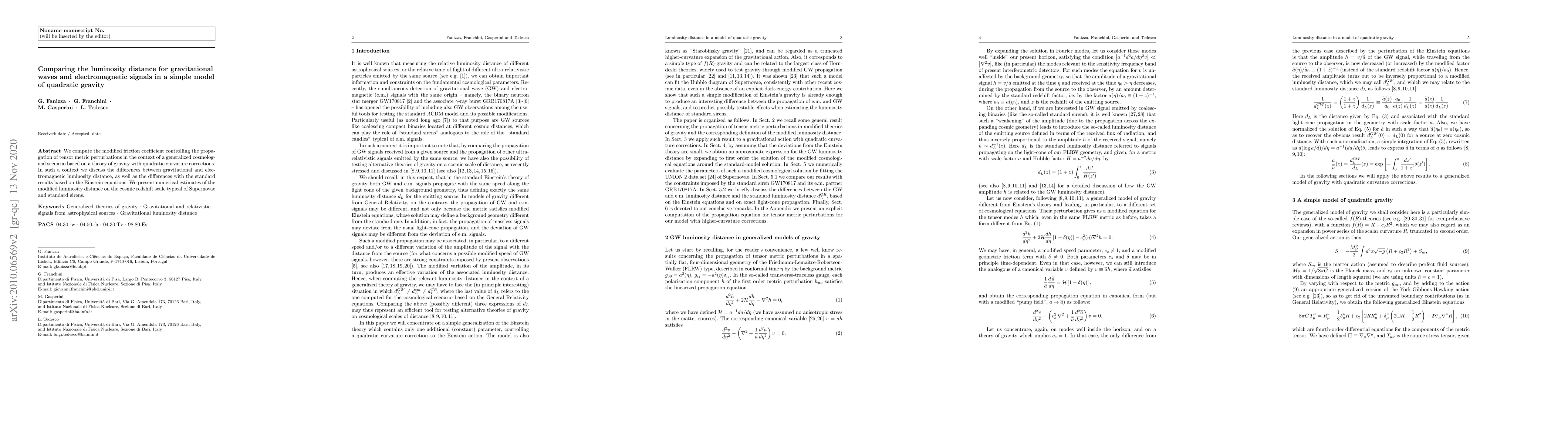 We compute the modified friction coefficient controlling the propagation of tensor metric perturbations in the context of a generalized cosmological scenario based on a theory of gravity with quadratic curvature corrections. In such a context we discuss the differences between gravitational and electromagnetic luminosity distance, as well as the differences with the standard results based on the Einstein equations. We present numerical estimates of the modified luminosity distance on the cosmic redshift scale typical of Supernovae and standard sirens.