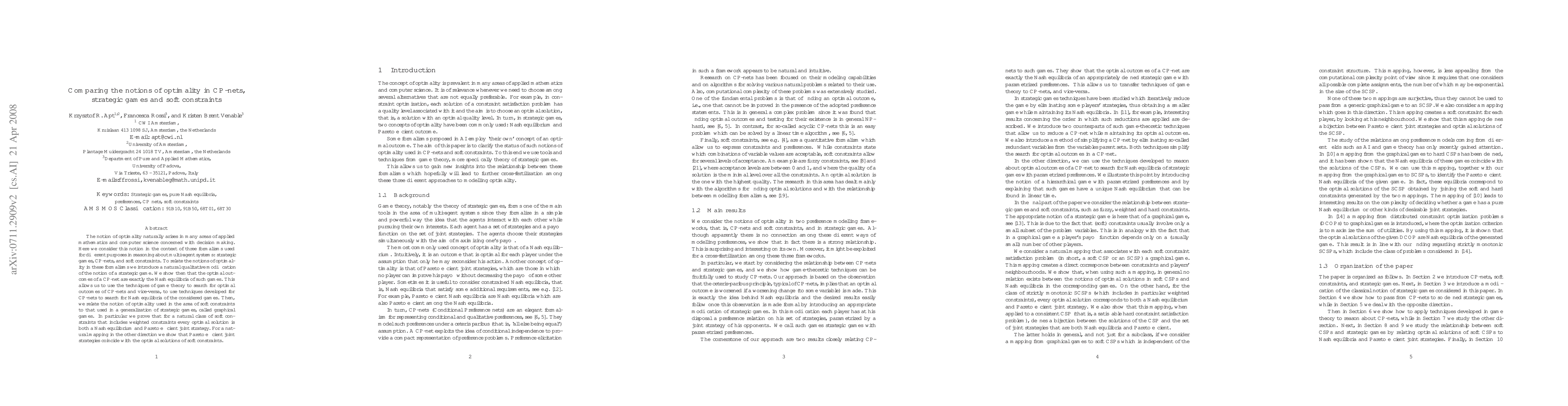 This paper explores the concept of optimality across three formalisms: strategic games, CP-nets, and soft constraints. It establishes a connection between optimal outcomes in CP-nets and Nash equilibria in modified strategic games, and relates soft constraints to graphical games, showing that optimal solutions in both contexts are Pareto efficient.