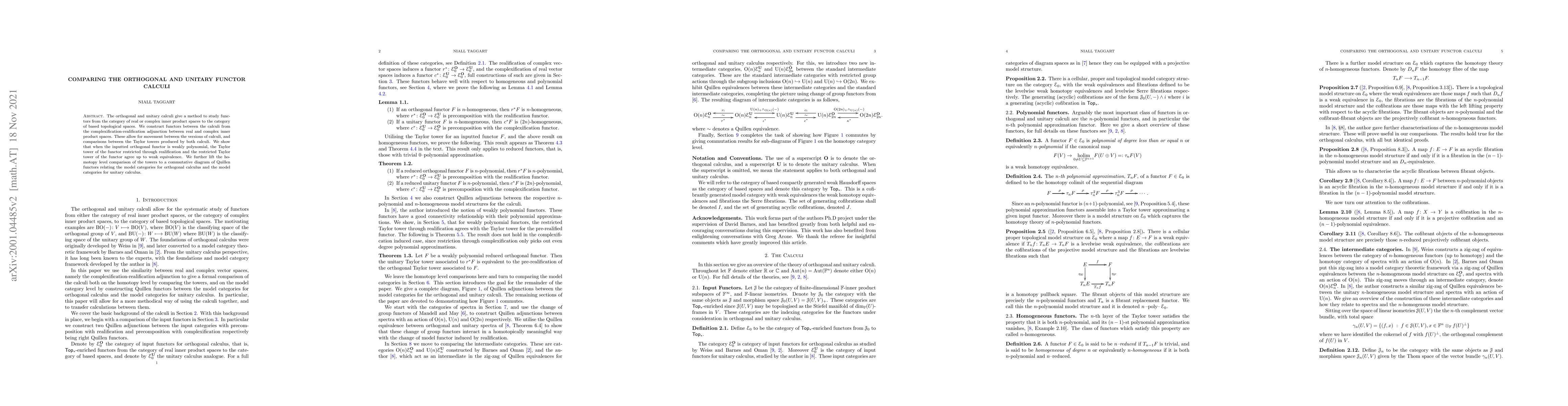 This paper constructs functors between orthogonal and unitary calculi for functors mapping real/complex inner product spaces to based topological spaces, showing agreement between Taylor towers for weakly polynomial orthogonal functors and establishing a homotopy-level comparison via Quillen functors.