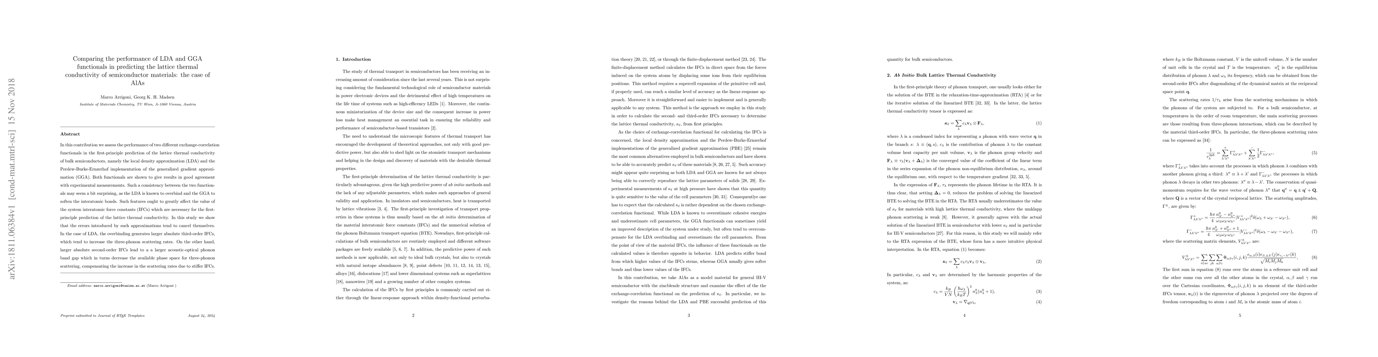 This paper compares the performance of LDA and GGA functionals in predicting the lattice thermal conductivity of AlAs, finding both give consistent results with experiments despite their known differences in interatomic bonding. The study reveals that errors from overbinding and softening of bonds tend to cancel out, leading to comparable predictions.