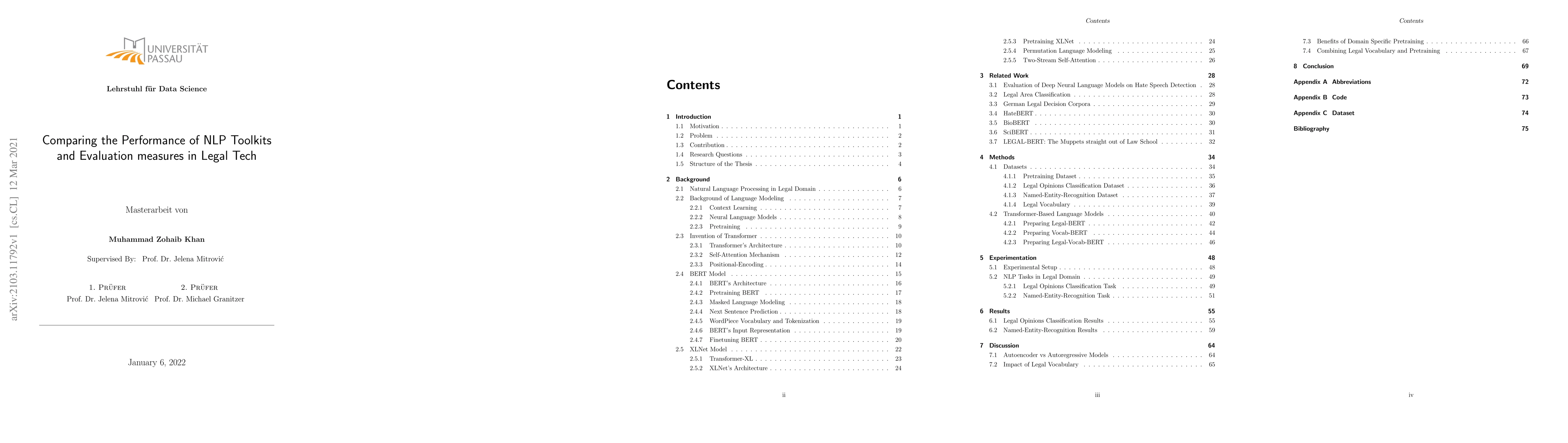 This paper compares the performance of NLP toolkits XLNet and BERT on legal tasks, finding that XLNet excels in Sequence Classification for Legal Opinions, while BERT is better for NER. Domain-specific pretraining and legal vocabulary enhancements further boost BERT's performance, with the Legal-Vocab-BERT model achieving superior results on legal tasks compared to general models.