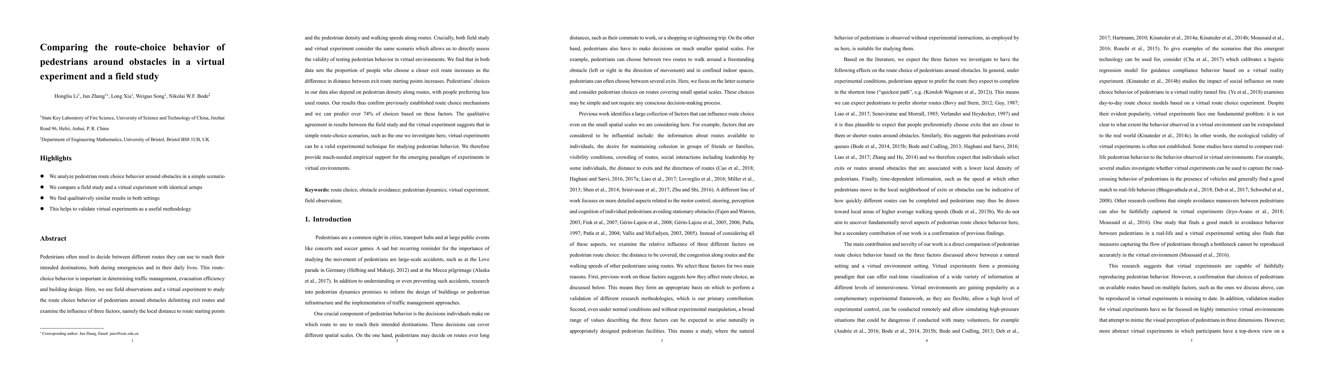 This study compares pedestrian route-choice behavior around obstacles in both field observations and virtual experiments, finding that people prefer shorter routes and less crowded paths. The results support the validity of using virtual environments to study pedestrian behavior in simple scenarios.