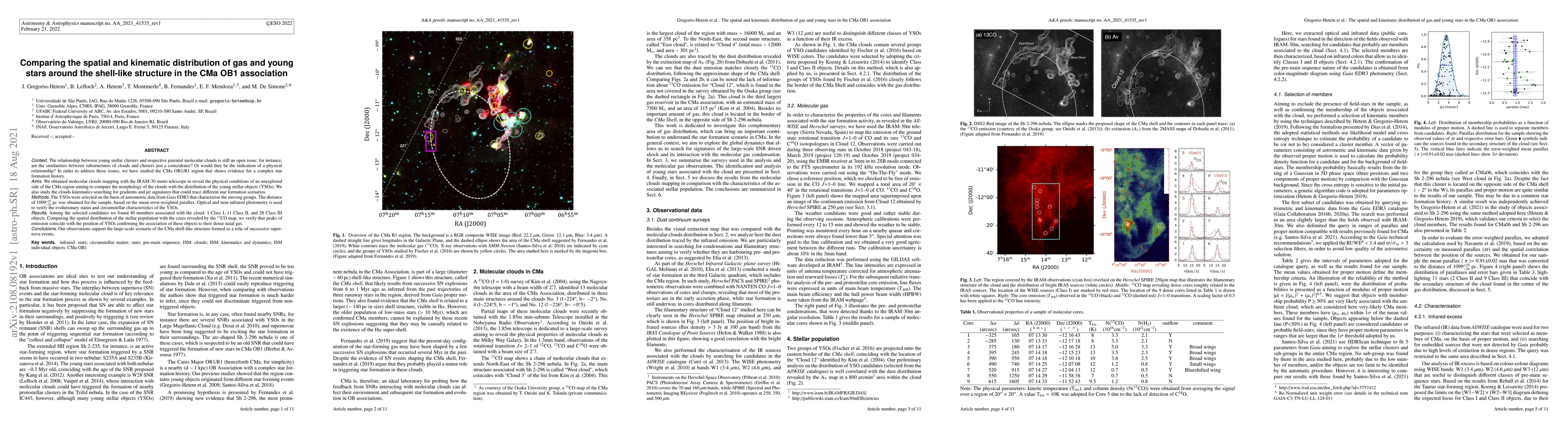 This study investigates the spatial and kinematic distribution of gas and young stars around the CMa OB1 association's shell-like structure, using IRAM-30m telescope data and Gaia EDR3 astrometric data. The findings suggest a physical relationship between the young stellar objects and their parental molecular clouds, supporting the CMa shell's formation by successive supernova events.